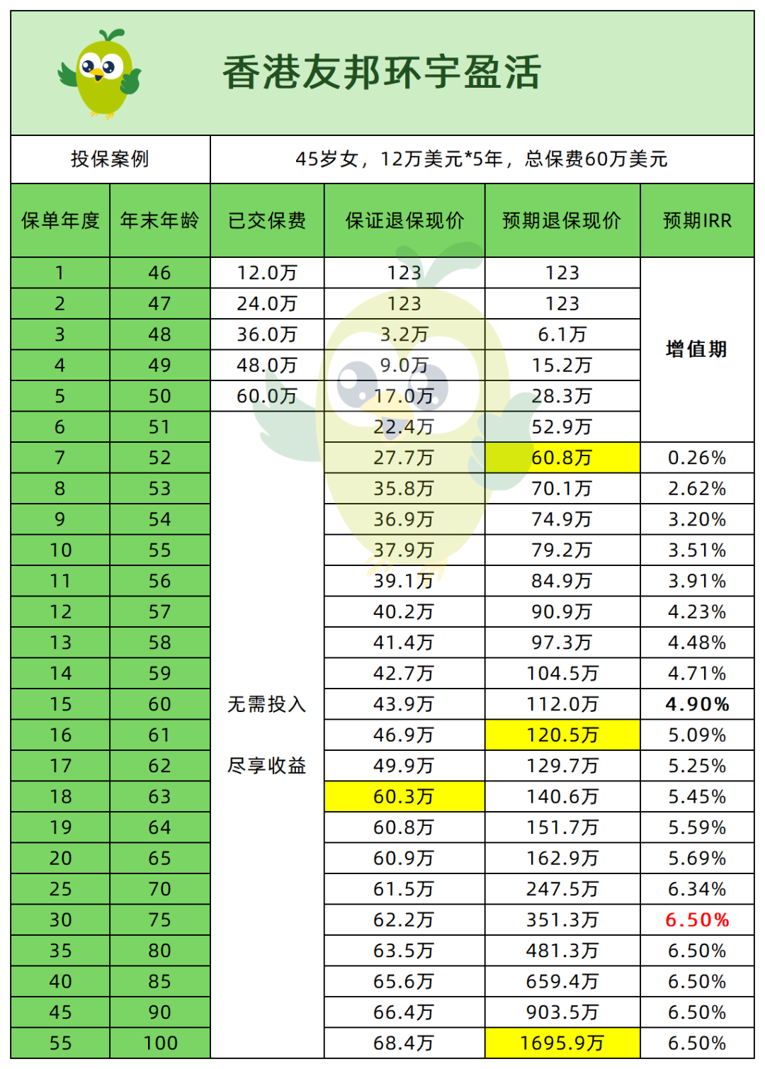 以友邦的王炸储蓄险为例,10年预期IRR达3.51%,20年IRR可达5.69%,30年IRR更是高达6.5%,收益翻了近6倍!