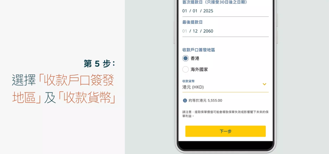 4、选择「领款货币」并点选保单,然后按「下一步」;
