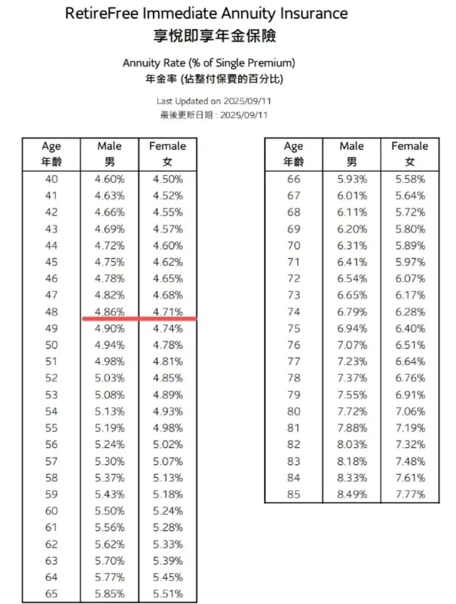 例如,55岁女性趸交100万美元,过犹豫期后每年可保证领取4.88万美元(月领4000余美元),且年龄越大领取比例越高。