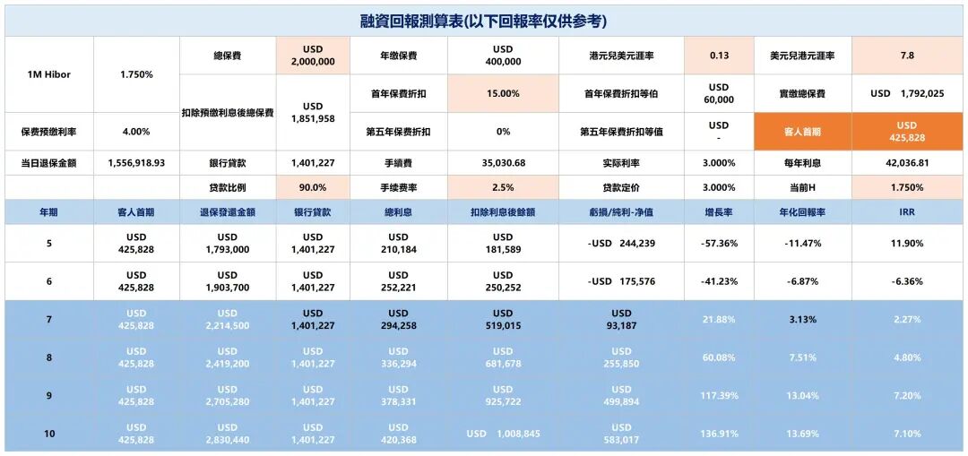 按照当前银行融资政策计算,丰饶传承3的融资保单预期复利可达7%以上,单利约13%,适合有杠杆投资需求且风险承受能力较强的投资者。