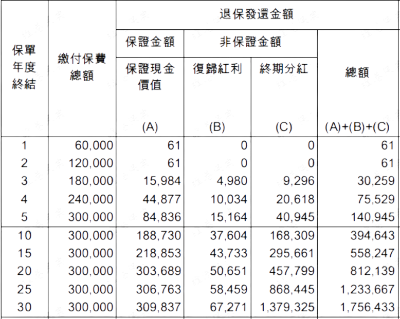 假设一位30岁女性每年缴纳6万美元,5年累计保费30万美元,持有30年后保单价值预计可达175万美元,增值近6倍。