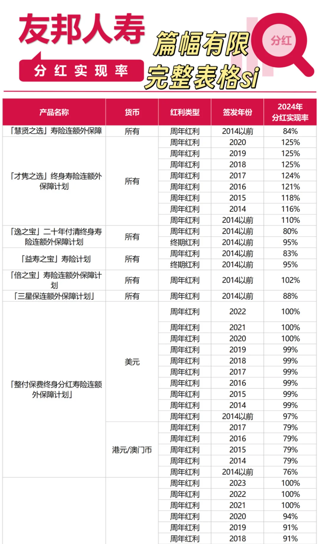友邦在这方面堪称行业标杆:五六十款分红产品都有10年以上历史数据,大部分产品实际分红率在97%-106%之间,基本实现“说多少给多少”。