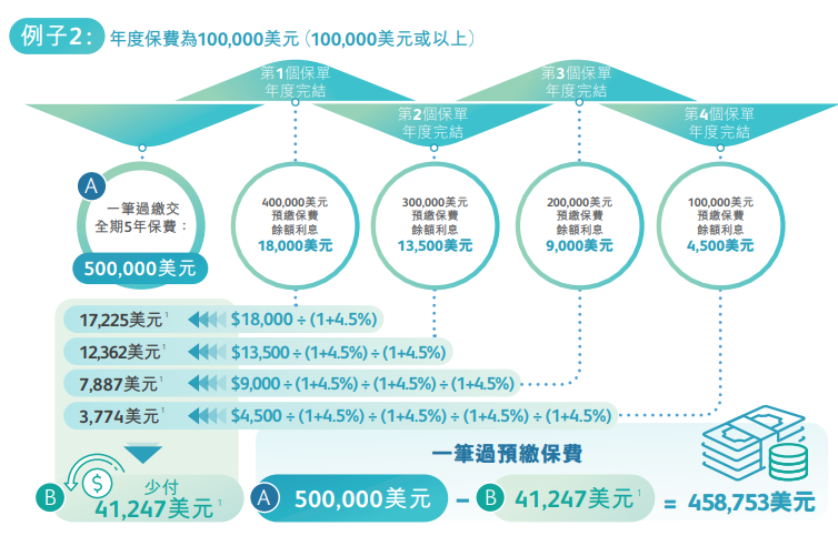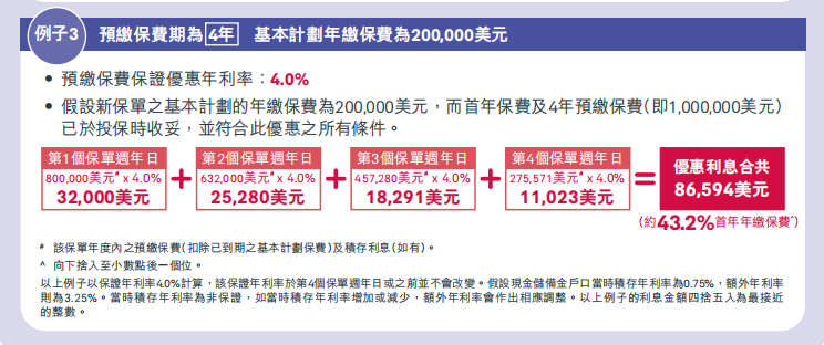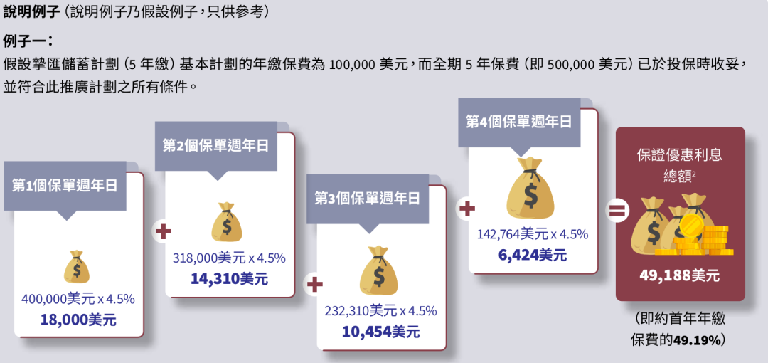 优惠2:预缴优惠预缴5年美元保单保费,保证利率高达7.5%(仅一年,其他年份提供非保证3.2%利率),2026年1月2日截止。