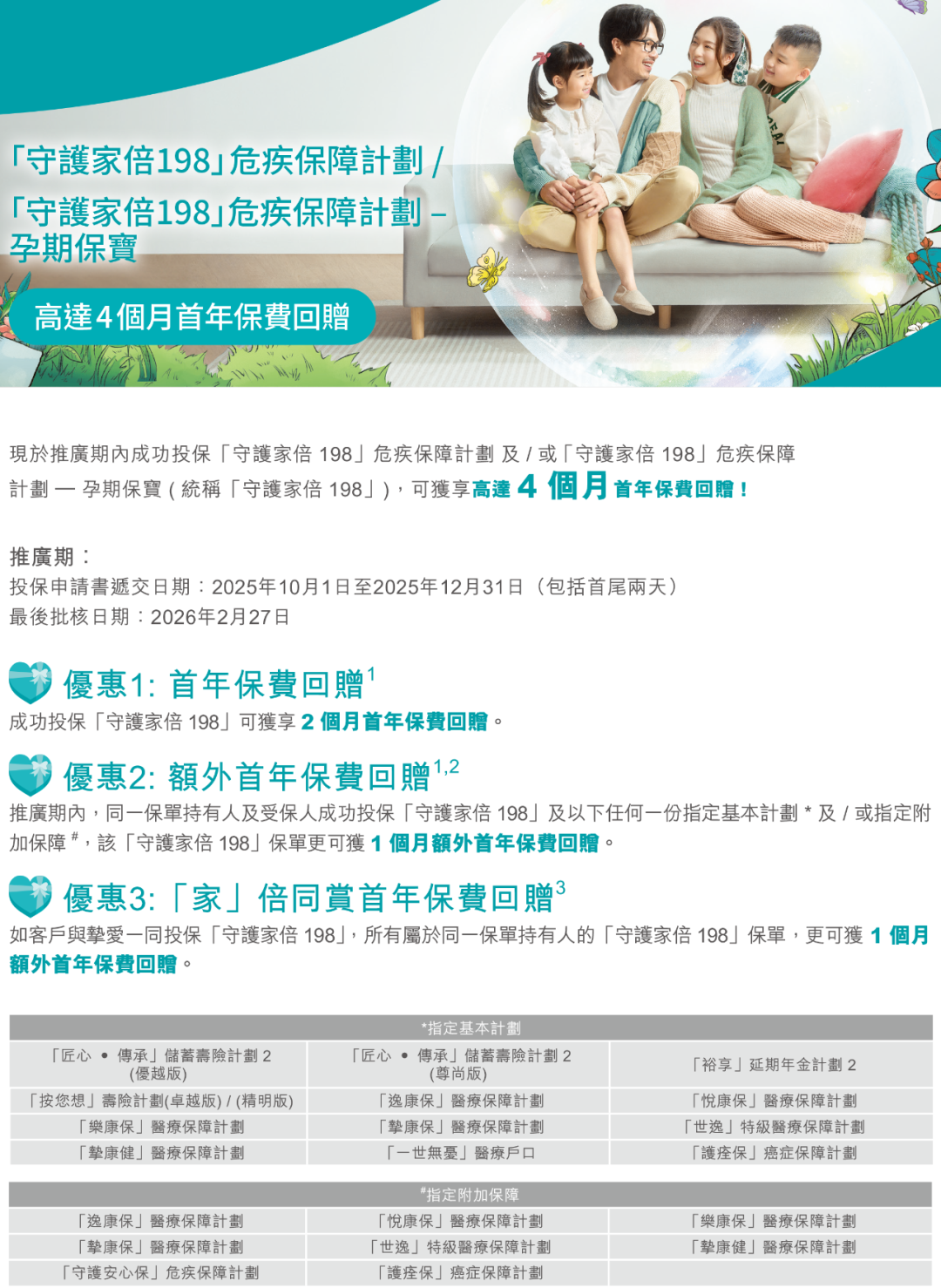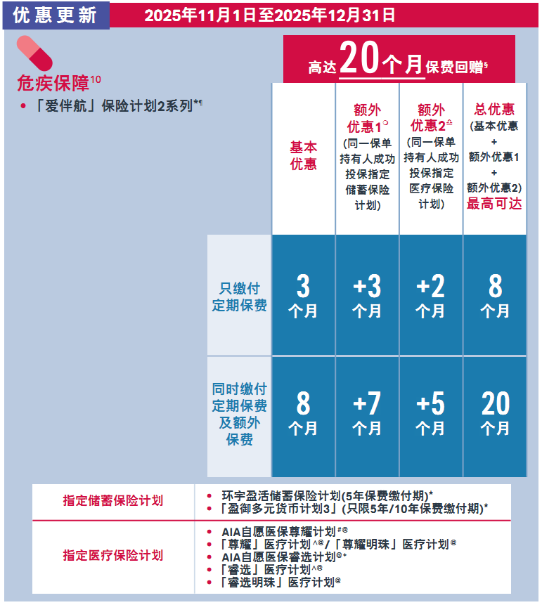 限时:2025年10月1日至12月31日优惠:享高达4个月首年保费回赠优惠