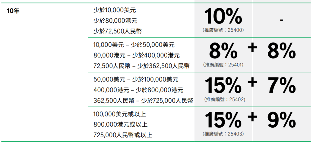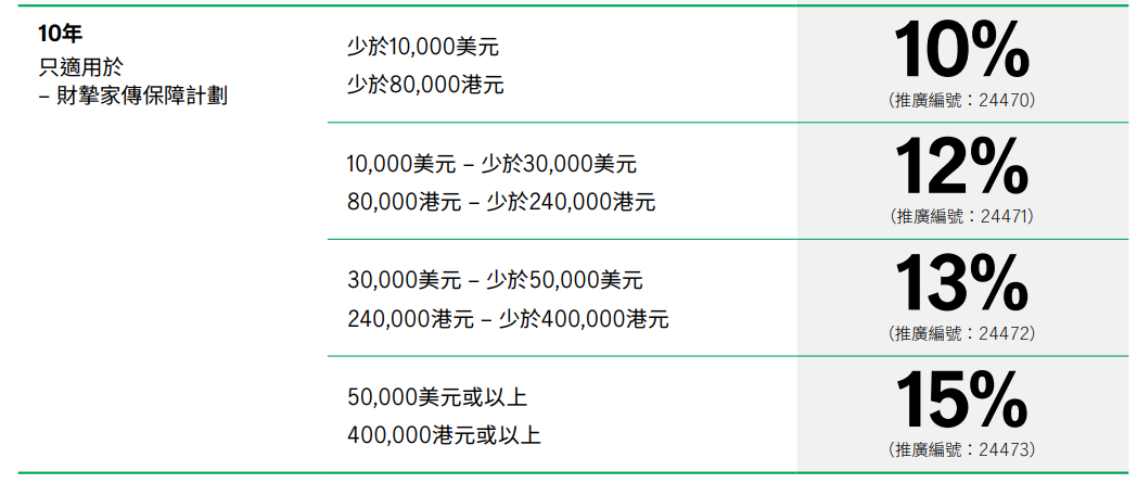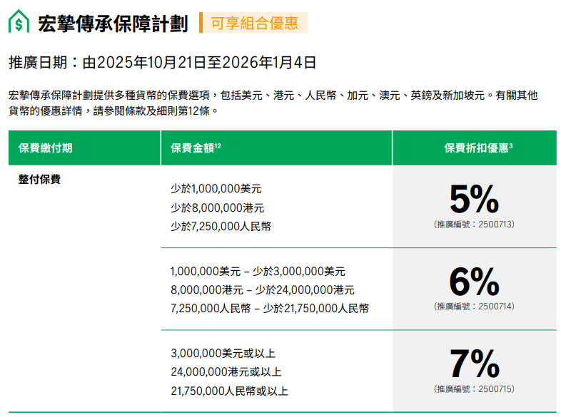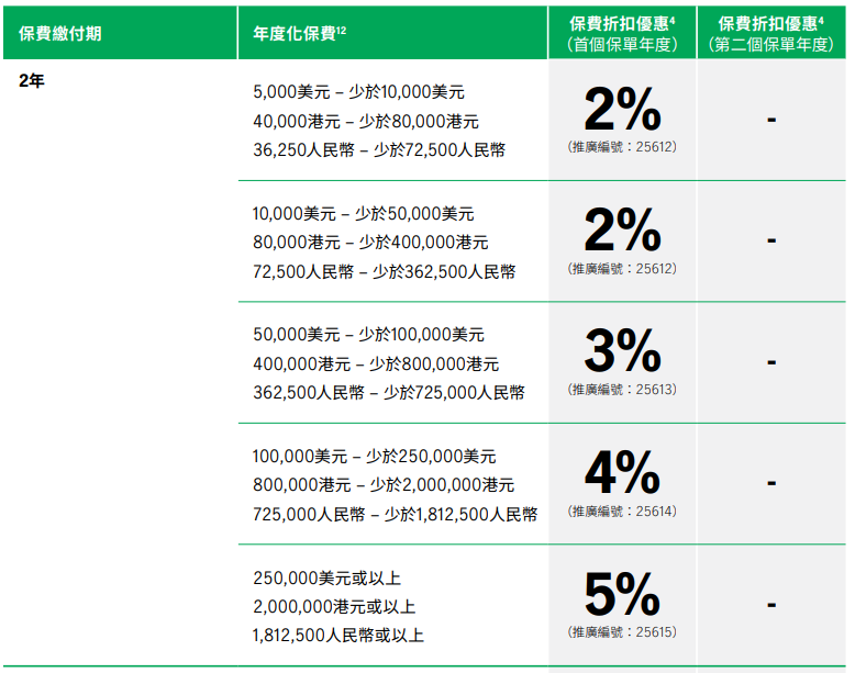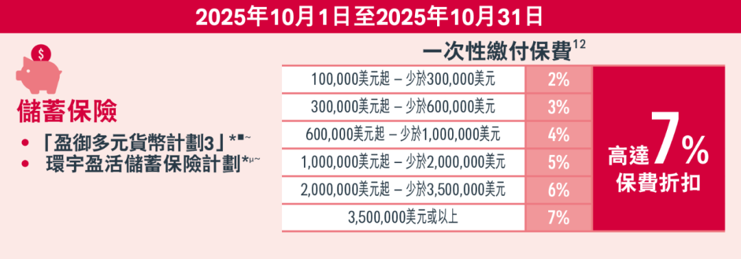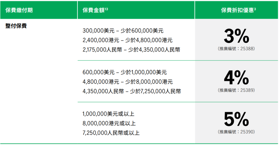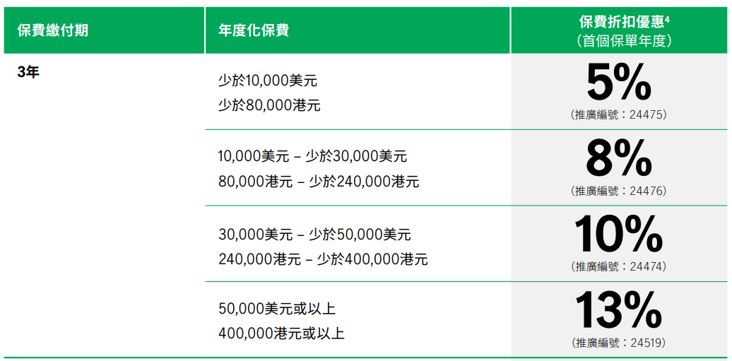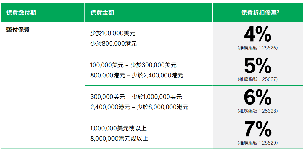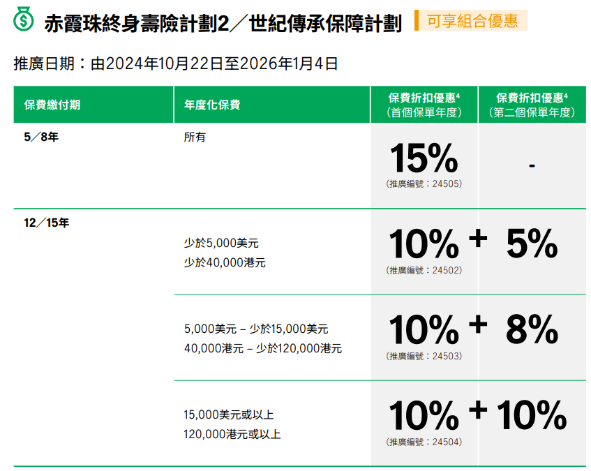 限时:2024年10月22日至2026年1月4日① 整付:整付保费享4%保費折扣优惠② 5/10年缴:享首年3%-8%保费折扣优惠