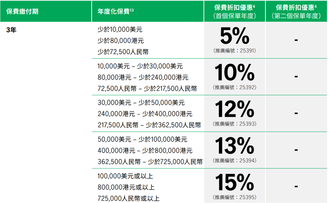 限时:2025年7月21日至2026年1月4日①整付:高达7%保费折扣优惠②3年缴:高达13%保费折扣优惠③10年缴:高达15%保费折扣优惠