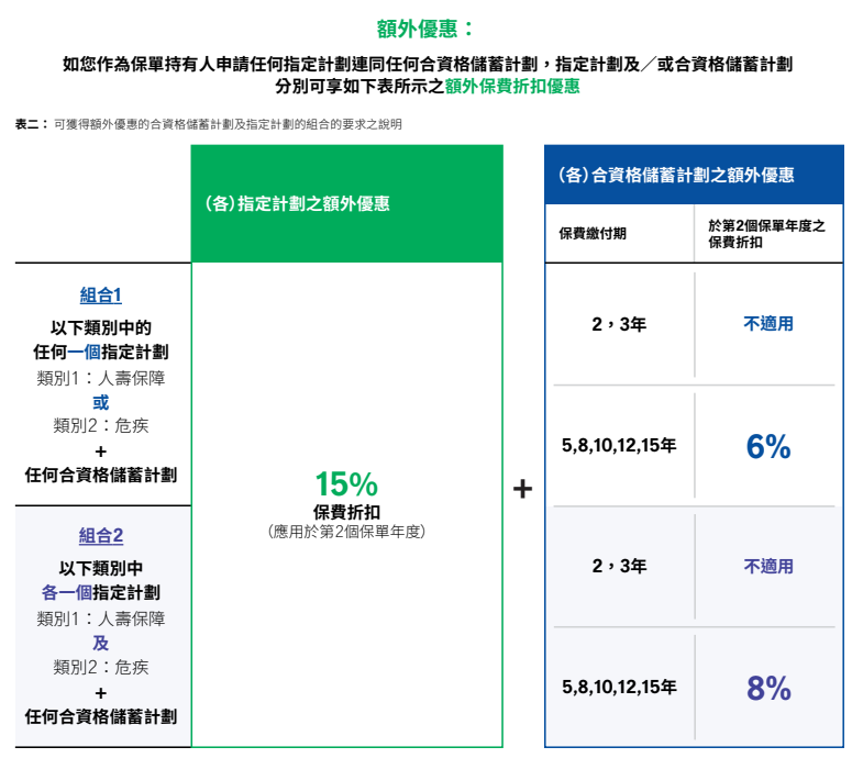 组合优惠限时:2025年7月21日-2026年1月4日优惠:指定组合,可在现有优惠基础上,第二个保单年度享额外高达10%/15%保费折扣