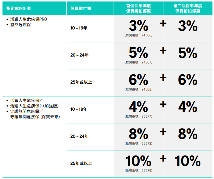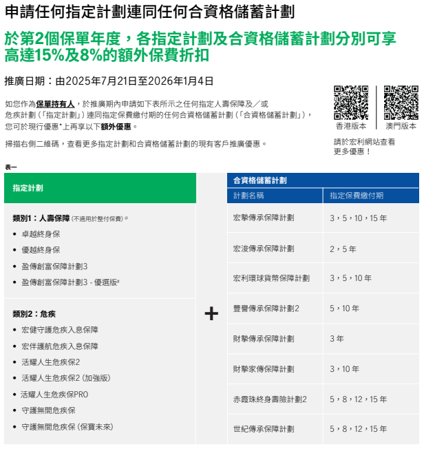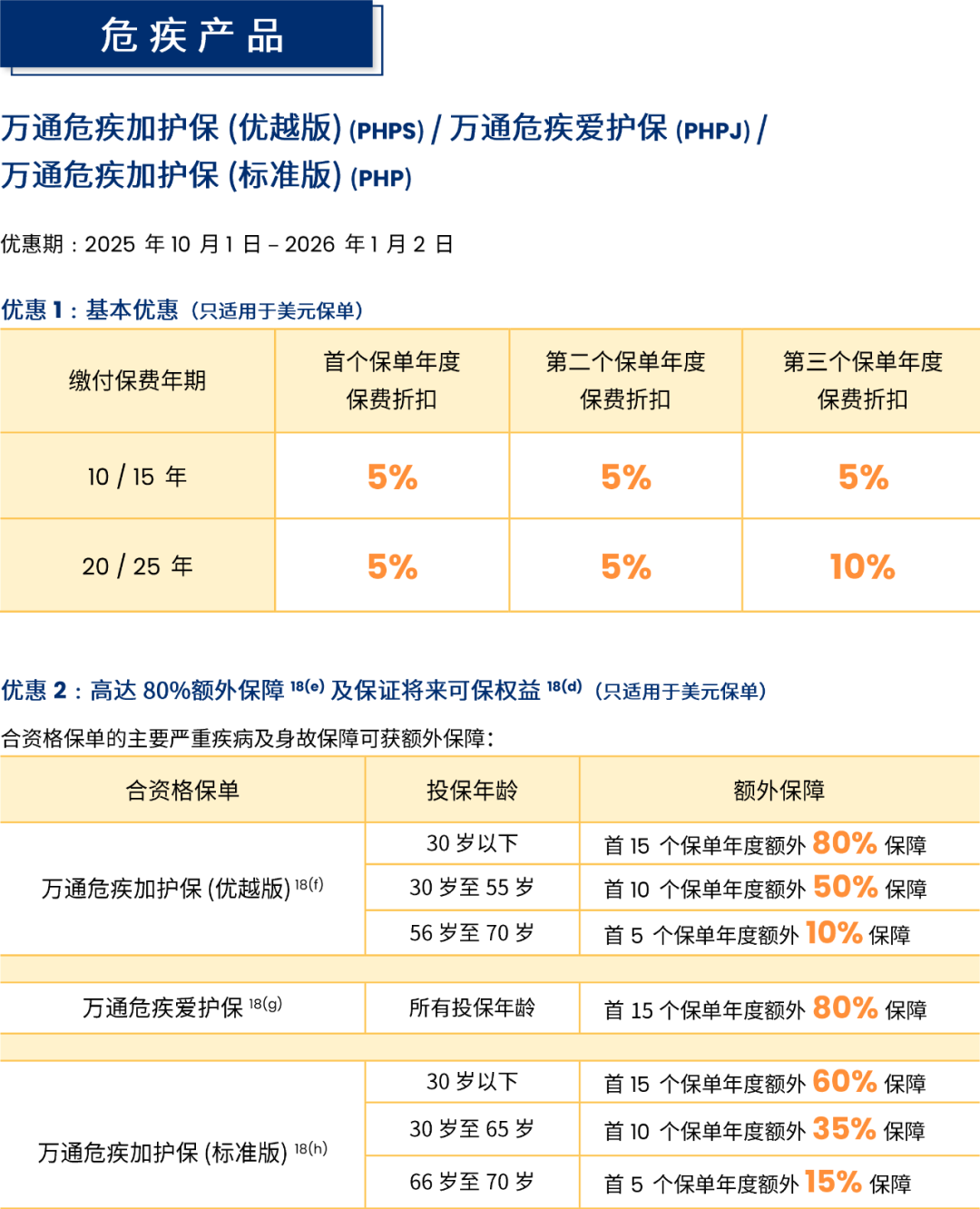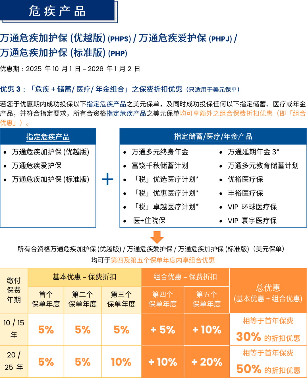 限时:2025年10月1日-2026年1月2日长达3年保费折扣,保费折扣合计高达20%!首15年额外保障高达80%!危疾+储蓄组合优惠高达50%!