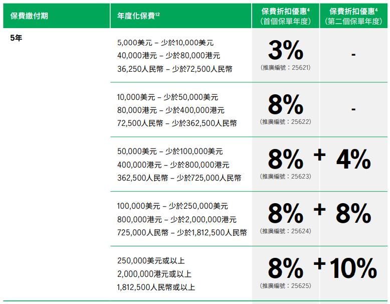 限时:2025年11月29日至12月31日优惠:5年缴「匠心传承2(尊尚版)」年缴保费<8万美元,预缴享4%保证利率优惠,相当于首年保费37%;年缴保费≥8万美元,预缴享4.5%保证利率优惠,相当于首年保费41%,预缴优惠可在投保时直接少交。首两年保费折扣高达24%。