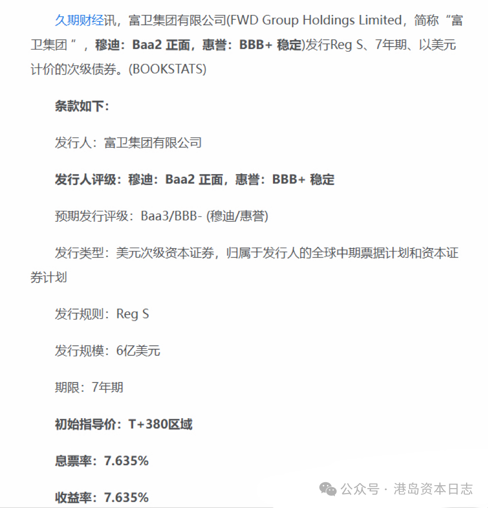 例如,富卫去年发行的7年期BBB-级债券,票面利率达到7.635%,获得了专业投资机构的积极认购。