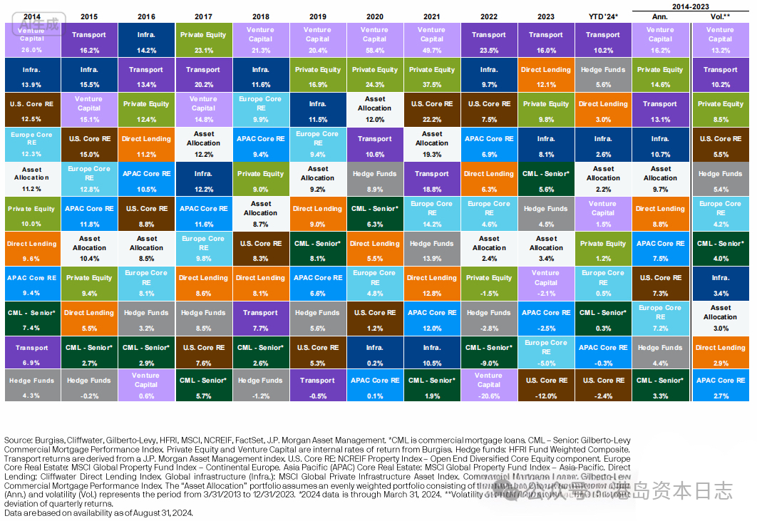 从2014年至2023年的数据可见,另类投资在多次市场波动中持续展现出优于传统资产的表现,其中部分优质类别(如核心私募股权与特定优质房地产领域)不仅回报稳健,也为投资组合的长期收益提供了可靠保障。