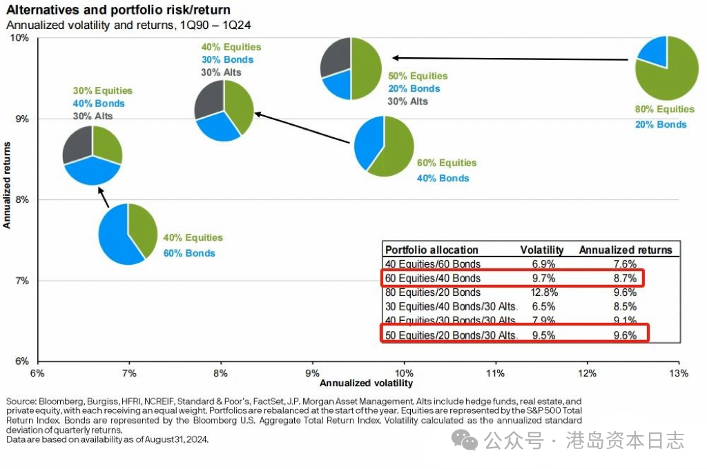 以2008年金融危机为例,标普500指数重挫37%,而同期全球基础设施基金仅下跌8%。根据摩根资产管理的分析,在投资组合中配置一定比例的另类资产(例如采取“60%股票 + 20%债券 + 20%另类资产”的结构),能够在不大幅影响整体收益的前提下,显著降低组合的波动性。