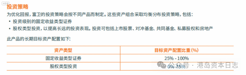 例如,富卫保险的“盈聚天下”计划就采用了这样的配置思路:其中债券等固定收益资产占比在25%至100%之间,而股票、基金、房地产等增长型资产的比例则在0%至75%之间浮动。
