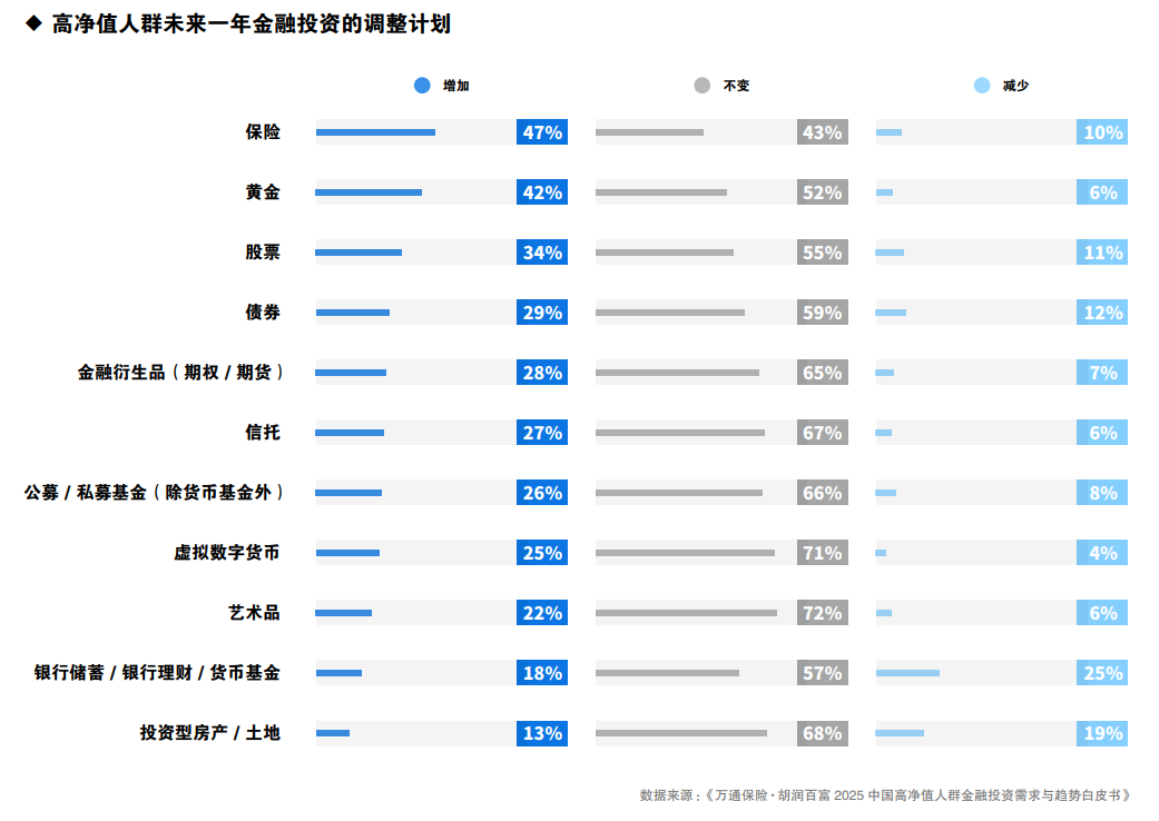 计划增加的投资类型前三位分别为保险47%、黄金42%和股票34%,分别对应资产安全、避险保值与长期增值的需求。