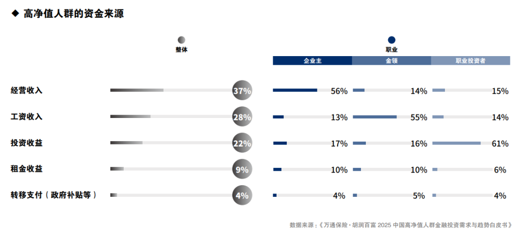 高净值人群的资金主要来自于经营收入37%、工资收入28%和投资收益22%,收入结构差异受职业属 性与财富创造模式影响 。