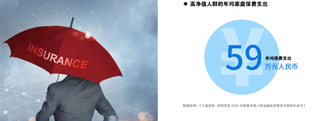 中国高净值家庭年均保费支出平均 59万元人民币。长期财富规划68%、资产安全隔离59%与家庭财富传承51%是高净值人群配置保险的主要目标,不仅反映了保险在财富结构中的权重上升,也标志着保险功能正从传统的风险转移工具,向资产配置与传承规划的战略组成部分转变。