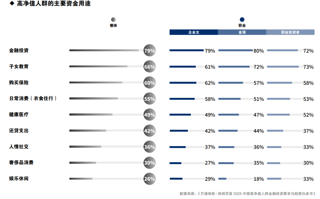 高净值人群当前的资金用途主要集中在金融投资79%、子女教育66%和购买保险60%,分别对应 资产保值增值、精英化教育投入以及风险隔离与财富传承 的需求。