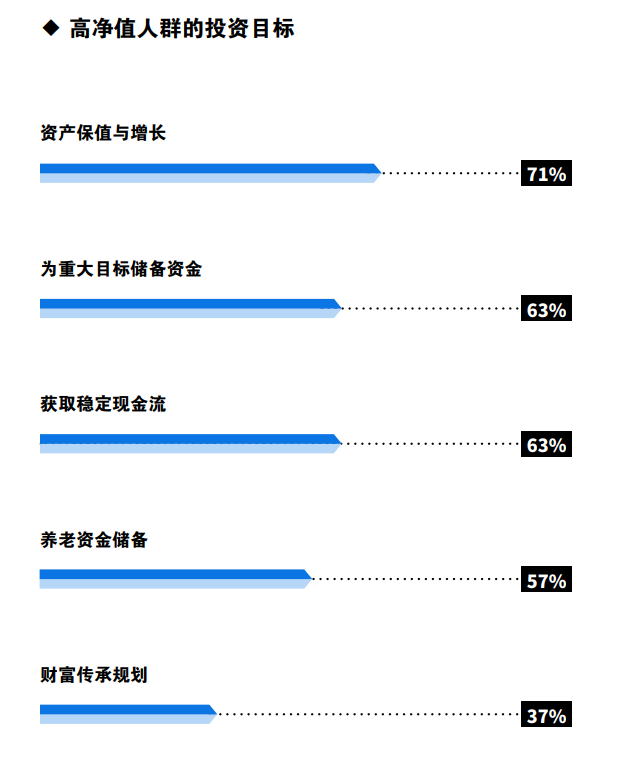 高净值人群中的稳健型投资者占比最高30%,投资策略以稳健的长期价值为核心特征。他们的首要财务目标是资产保值与增长71%,其次是为重大事项储备资金以及获取稳定现金流均为63%。