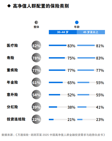 医疗险(82%)、寿险(78%)和重疾险(77%)是目前高净值人群中最普遍配置的三大险种,这一结构清晰地反 映了该群体对健康保障与财务安全的基础性需求。