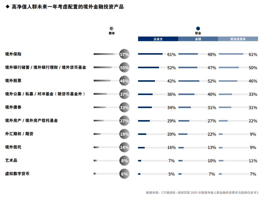在产品选择上,境外保险57%、境外银行储蓄/理财/货币基金50%和境外股票46%最受关注,整体策略兼顾保障、流动性与长期增值。