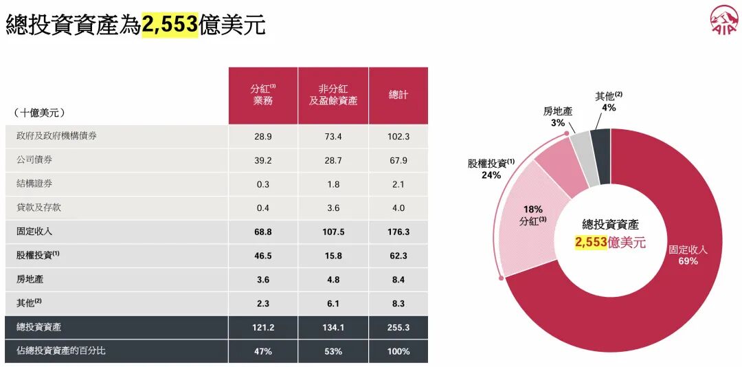 01友邦友邦资产结构:以固收类资产为主(69%),权益类资产占24%,房地产占3%。债券布局:超长期限债券占比高(72%以上),聚焦亚太地区,尤其是中国内地(45%),债券评级以A+及以上为主。投资风格:稳健均衡,注重长期收益稳定性,适合长期配置和家族传承需求。友邦总资产2,553亿美元(约2万亿人民币),主要分成四大类: