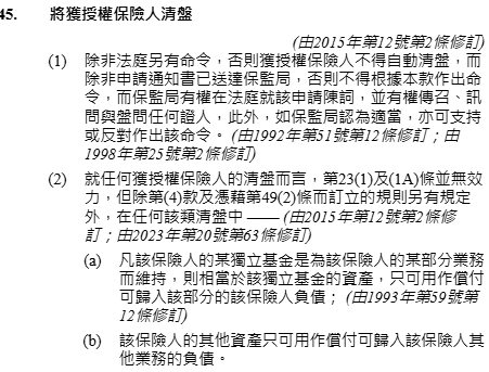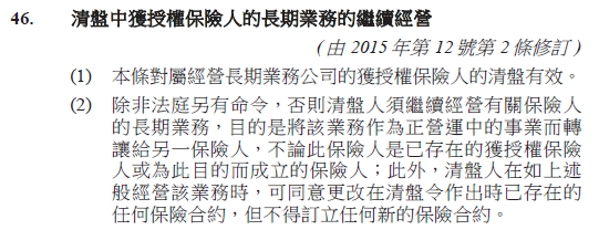 第三,《保险业条例》第45条规定了,保险公司不得自动清盘,第46条则规定了清盘人须继续经营有关保险人的长期业务,目的是将该业务作为正营运中的事业而转让给另一保险人。因此,即使真的遇到保险公司清盘,保单通常也会由接手的保险公司继续承保。