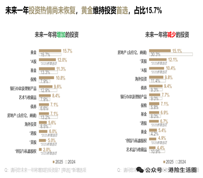 报告中还可见一个明显趋势:当前中国高净值人群投资重点在于减持不动产,增持黄金和保险投资。
