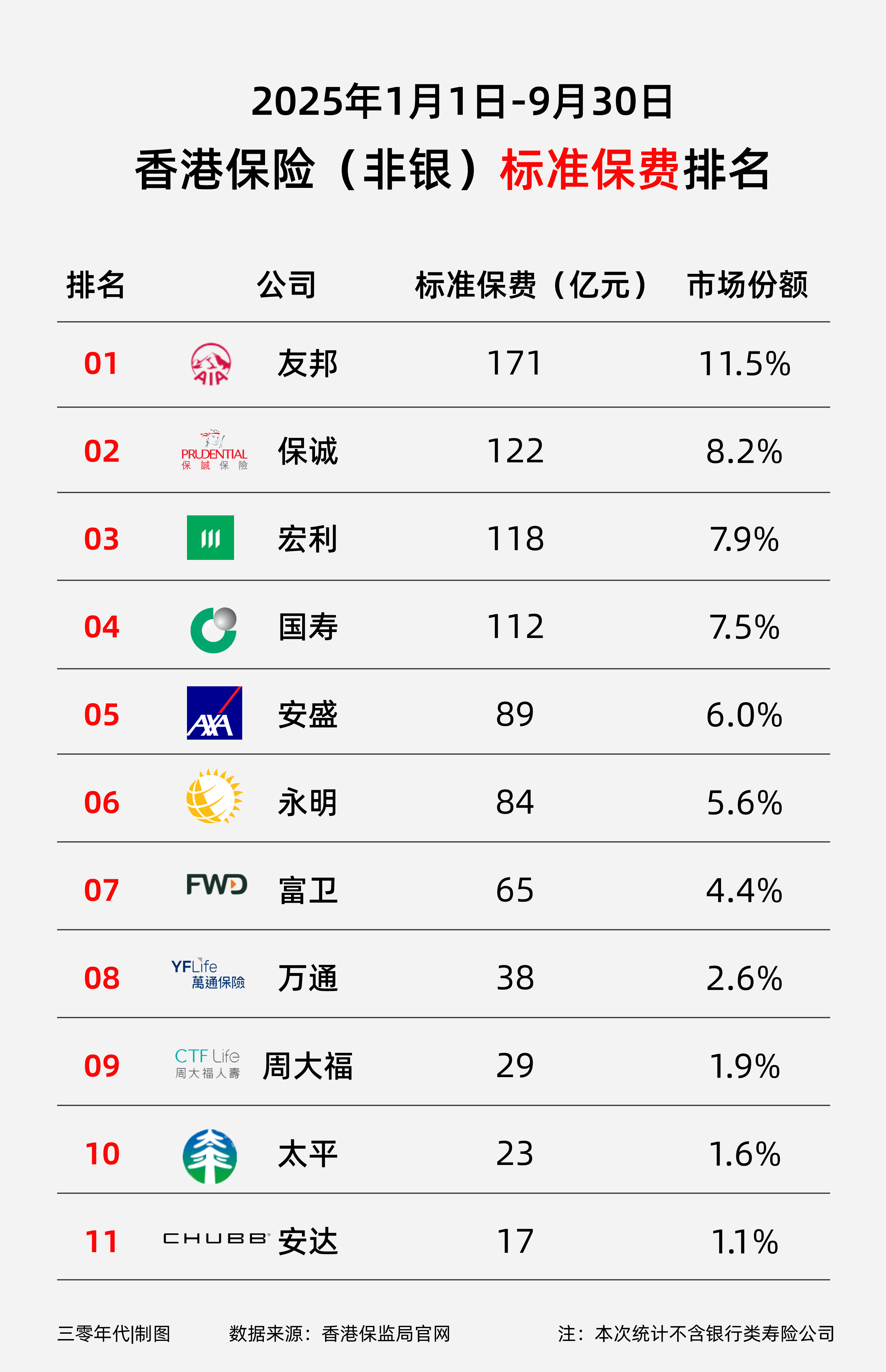按照标准保费收入,即整付*10%+年度化保费排名,前五大保险公司(非银)分别为友邦、保诚、宏利、国寿及安盛。