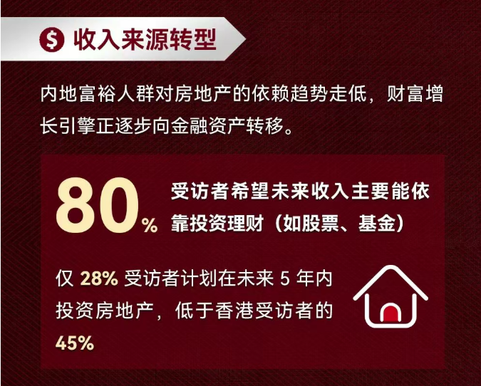 80%的内地受访者期望未来主要收入来源为股票、基金等投资理财收益,仅有28%计划在未来五年投资房产。