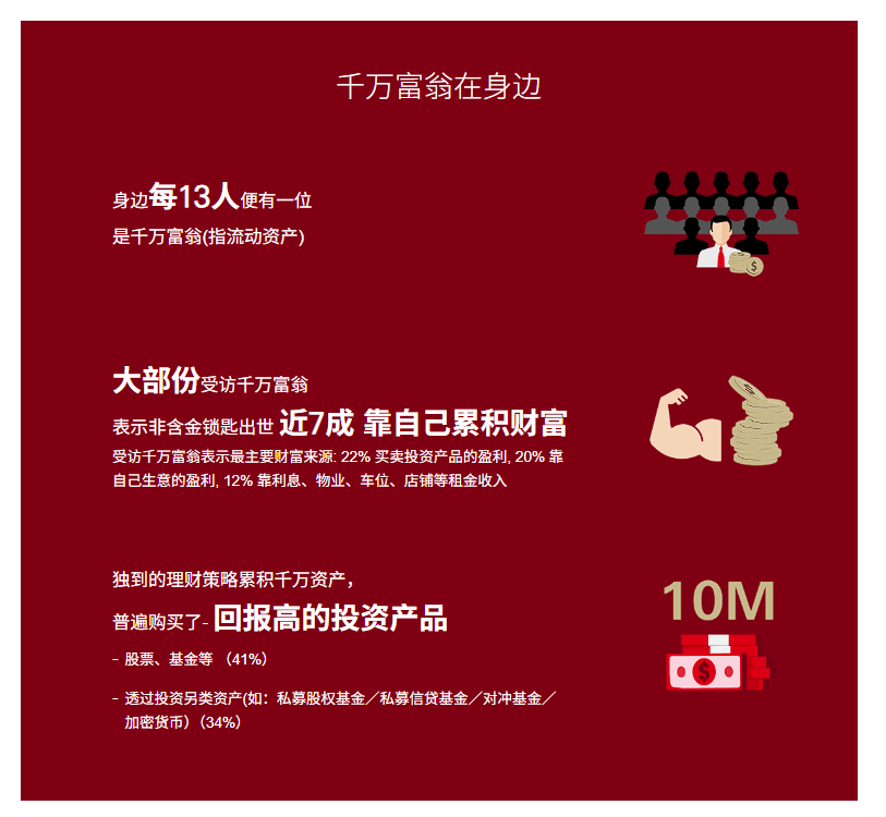 在产品选择上,41%的千万富翁青睐股票、基金等传统高回报产品,34%将目光投向私募股权基金、对冲基金及加密货币等另类资产。
