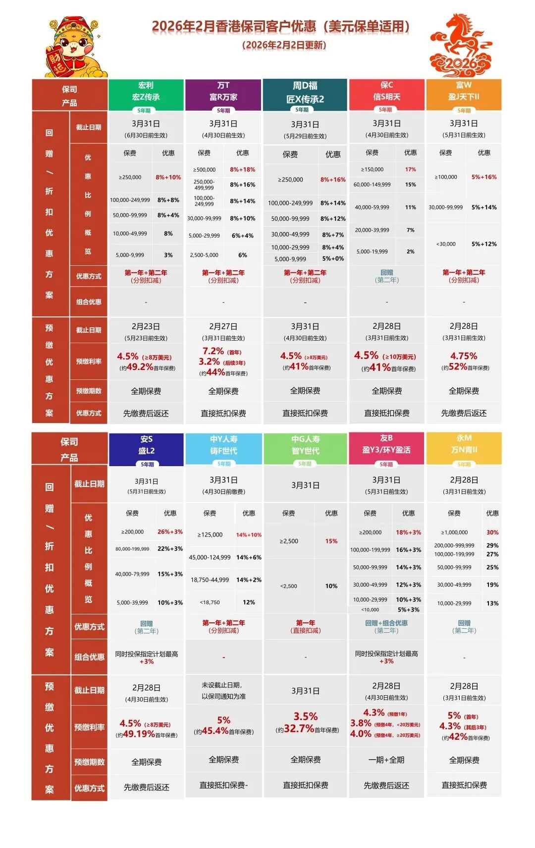 友邦「环Y盈活」预缴高达4.3%保证利率,2月28日截止;保诚「信S明天/启Y未来」预缴高达4.5%保证利率,2月28日截止;宏利「宏Z传承/宏Z家传承(5年)」预缴利率4%/4.5%,同时投保危疾/人寿,预缴利息额外多0.5%,高达5%,2026年2月23日截止;5年缴首两年保费折扣高达18%,3月31日截止;万通「富饶万家」预缴利率高达7.2%,2月27日截止;5年缴保费折扣首两年合计高达26%,3月31日截止;富卫「盈J天下2」,预缴利率高达4.75%,2月28日截止;周大福人寿「匠X传承2」预缴利率高达4.5%,3月31日截止;永明「万年Q·星H尊享II」预缴首年5.5%后续4.3%,年缴保费回赠高达28%+预缴优惠44%=合计高达72%年缴保费
