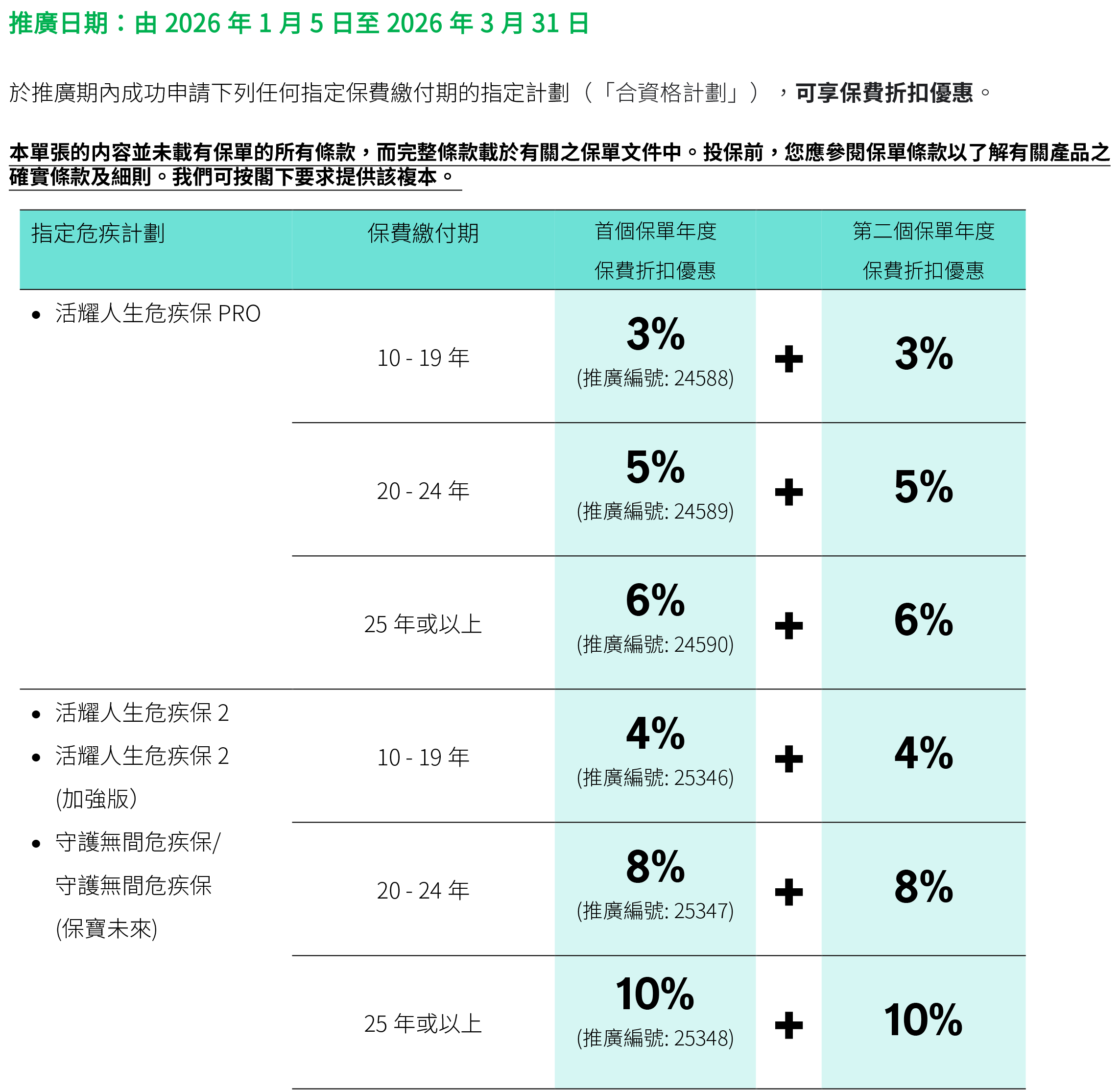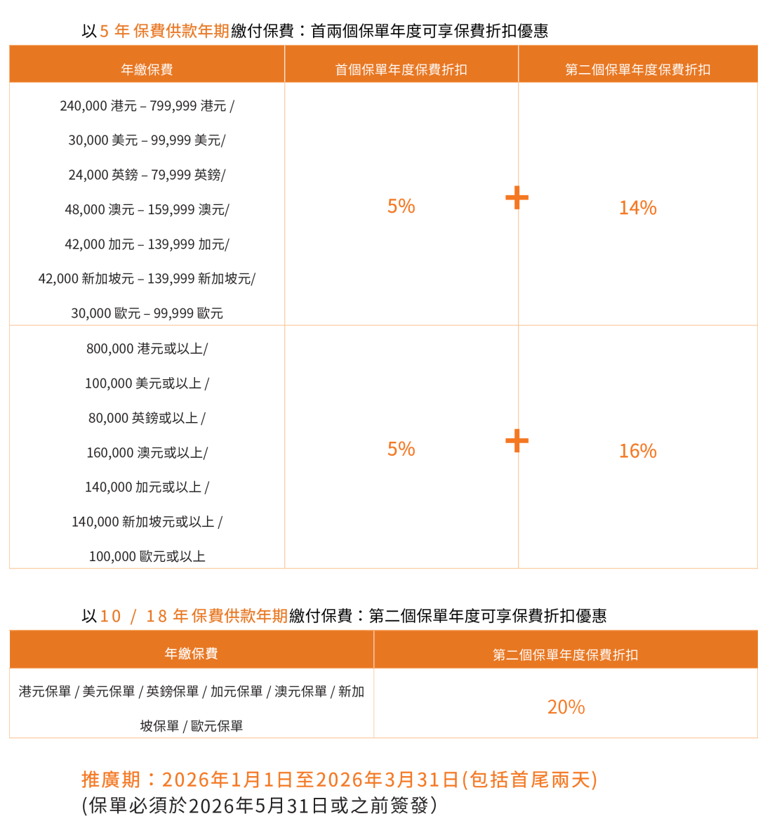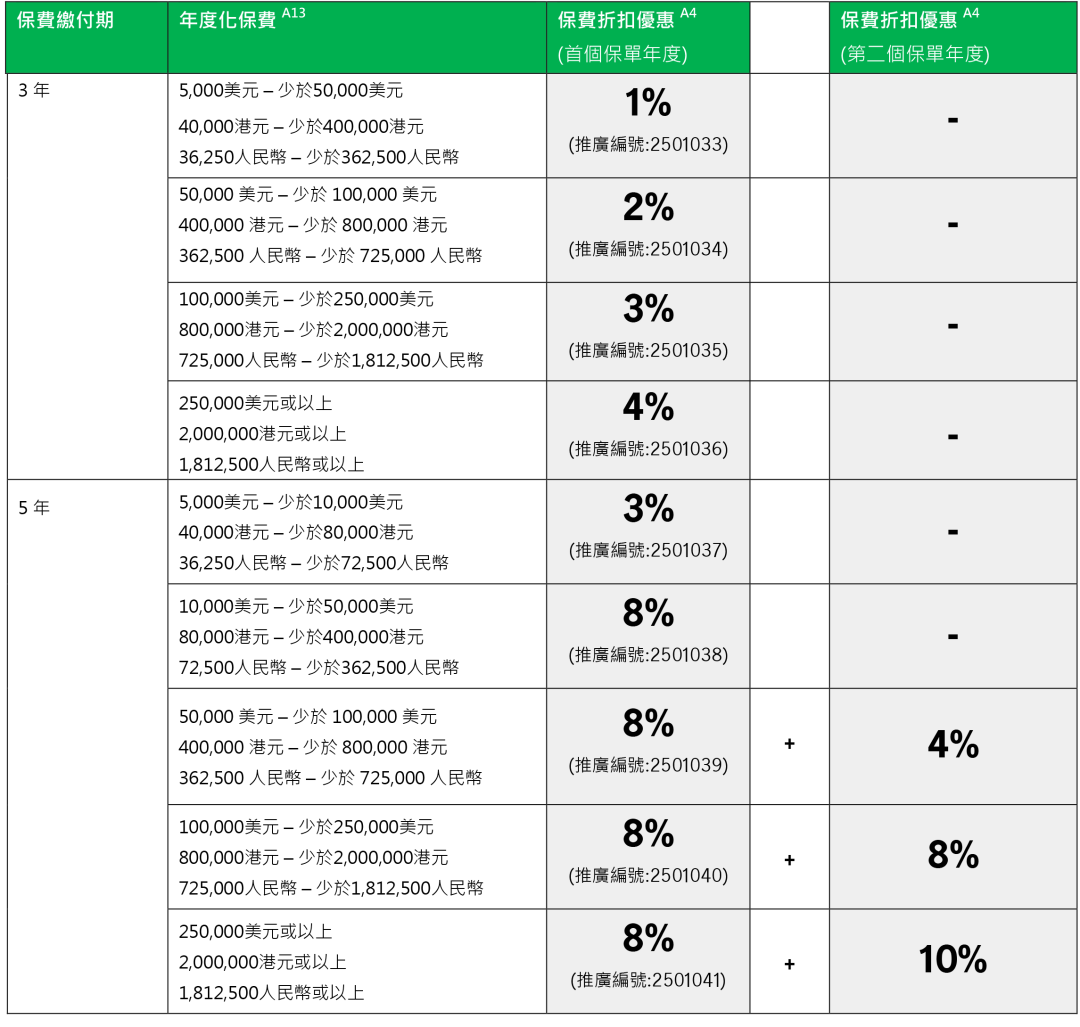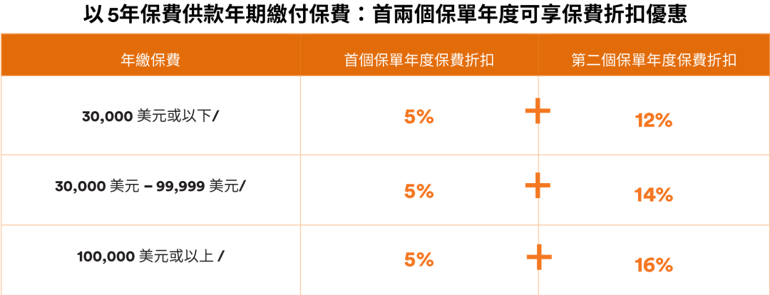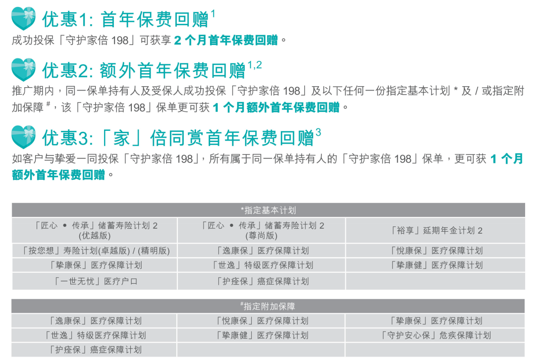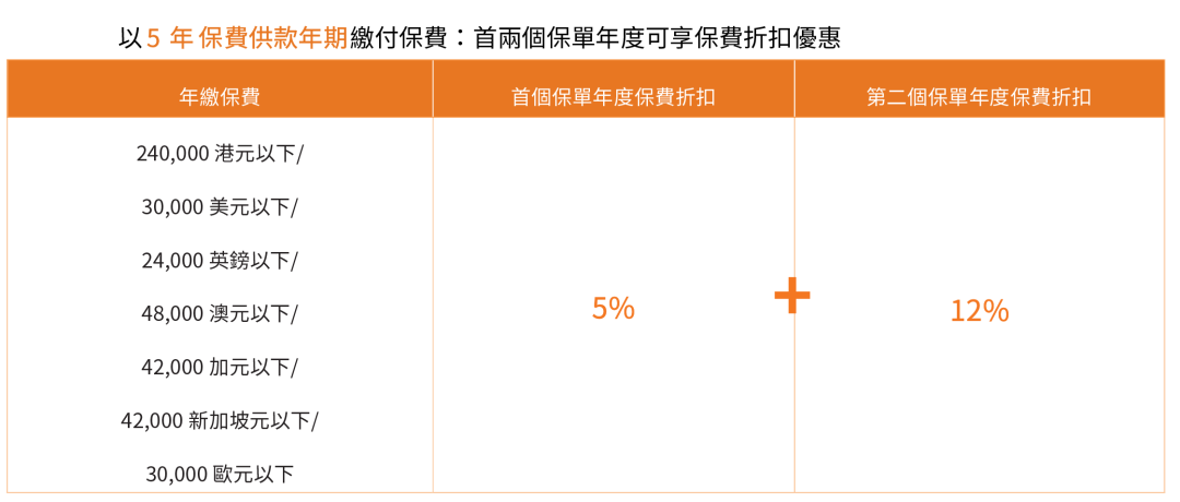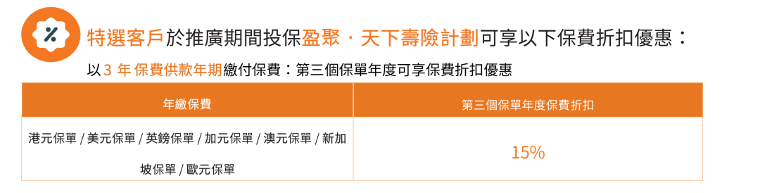 2026年1月5日至2026年3月31日优惠:同一投保人于推广期内申请以下指定计划连同指定缴费期的合资格产品,可在现行优惠基础上,第二个保单年度额外享更高达15%/8%保费折扣优惠