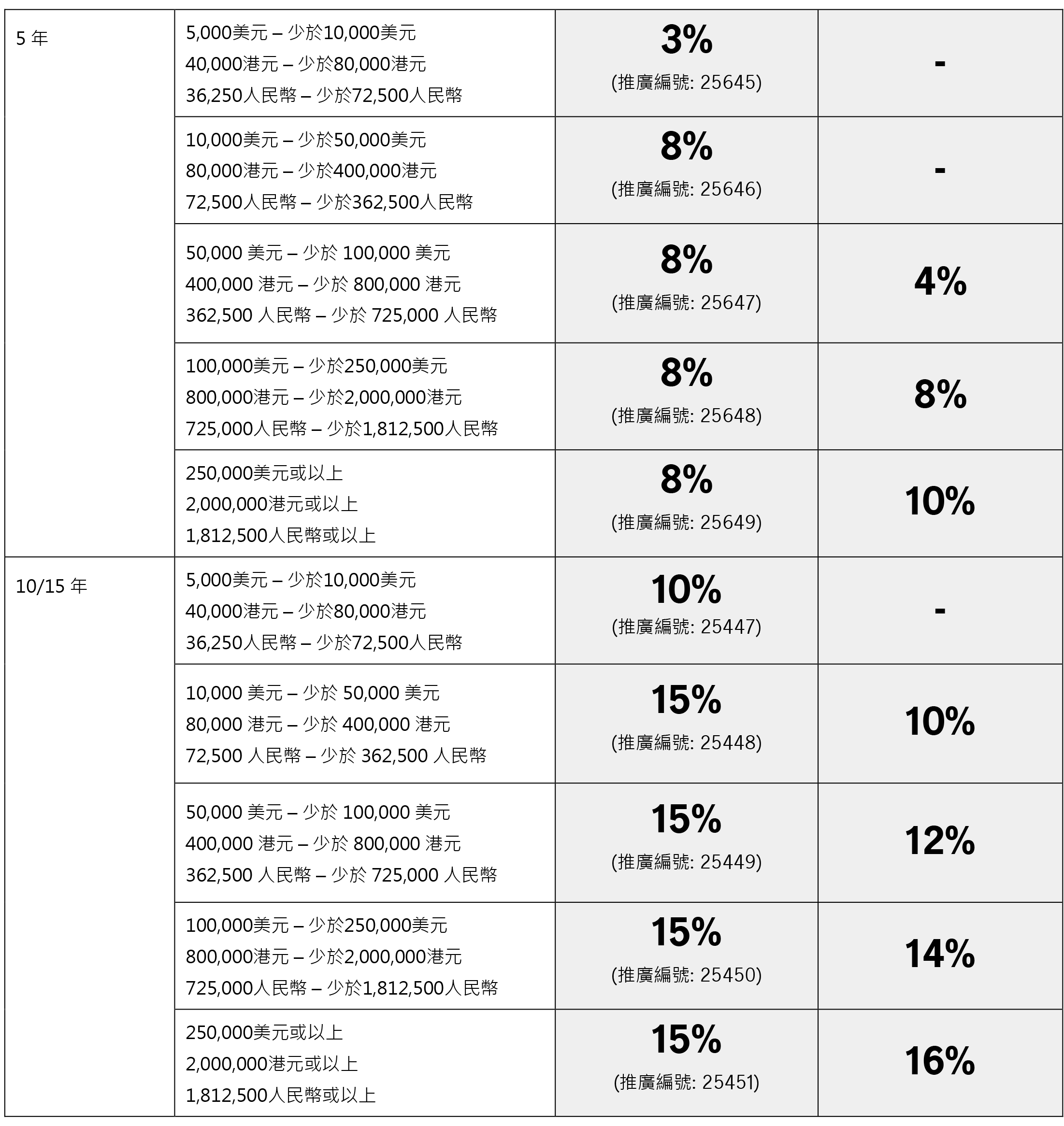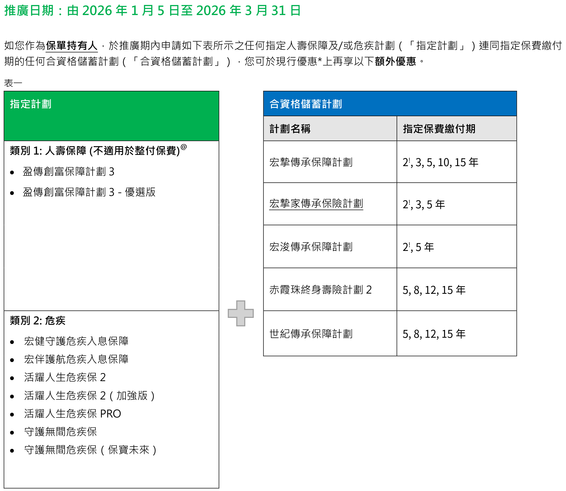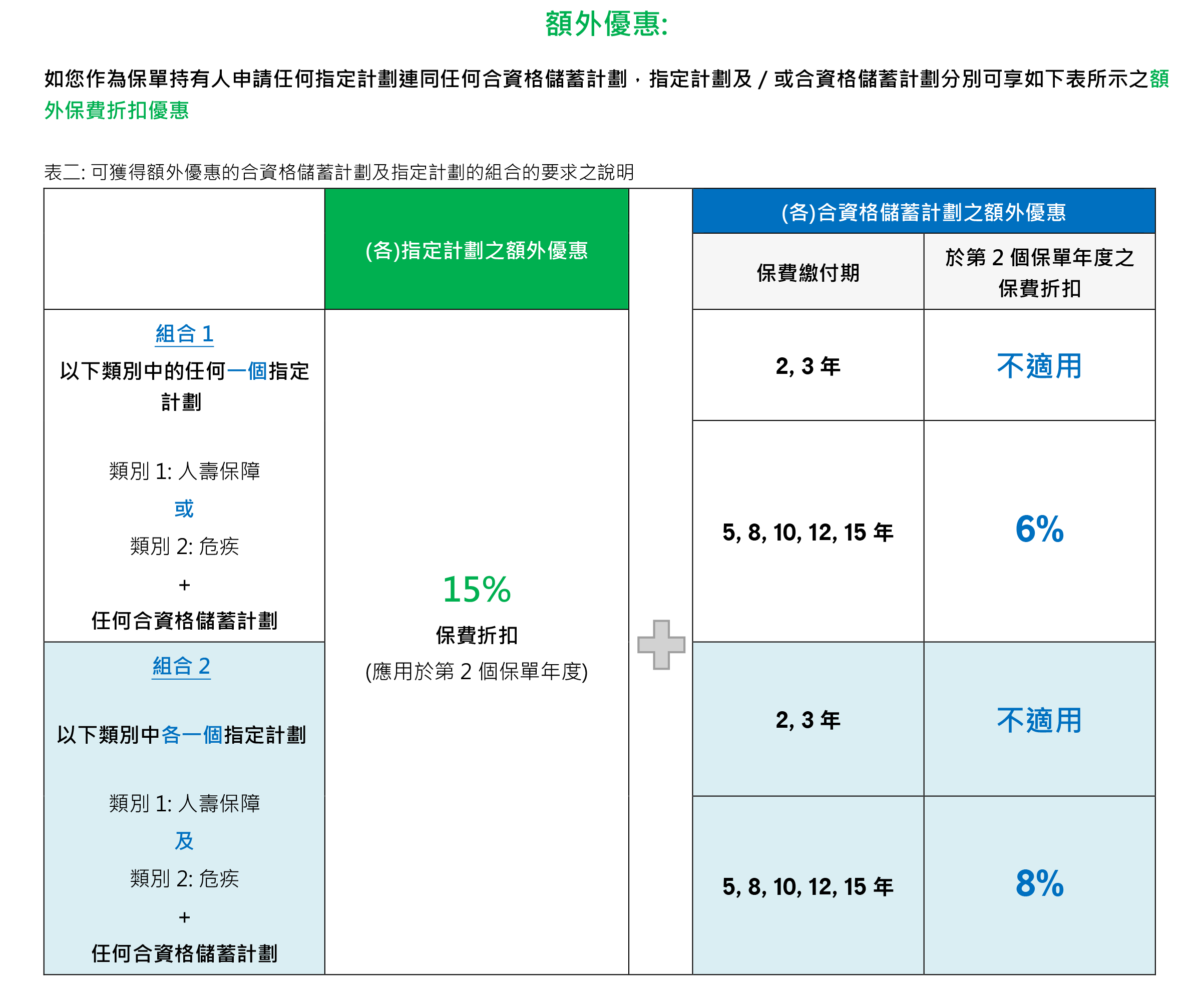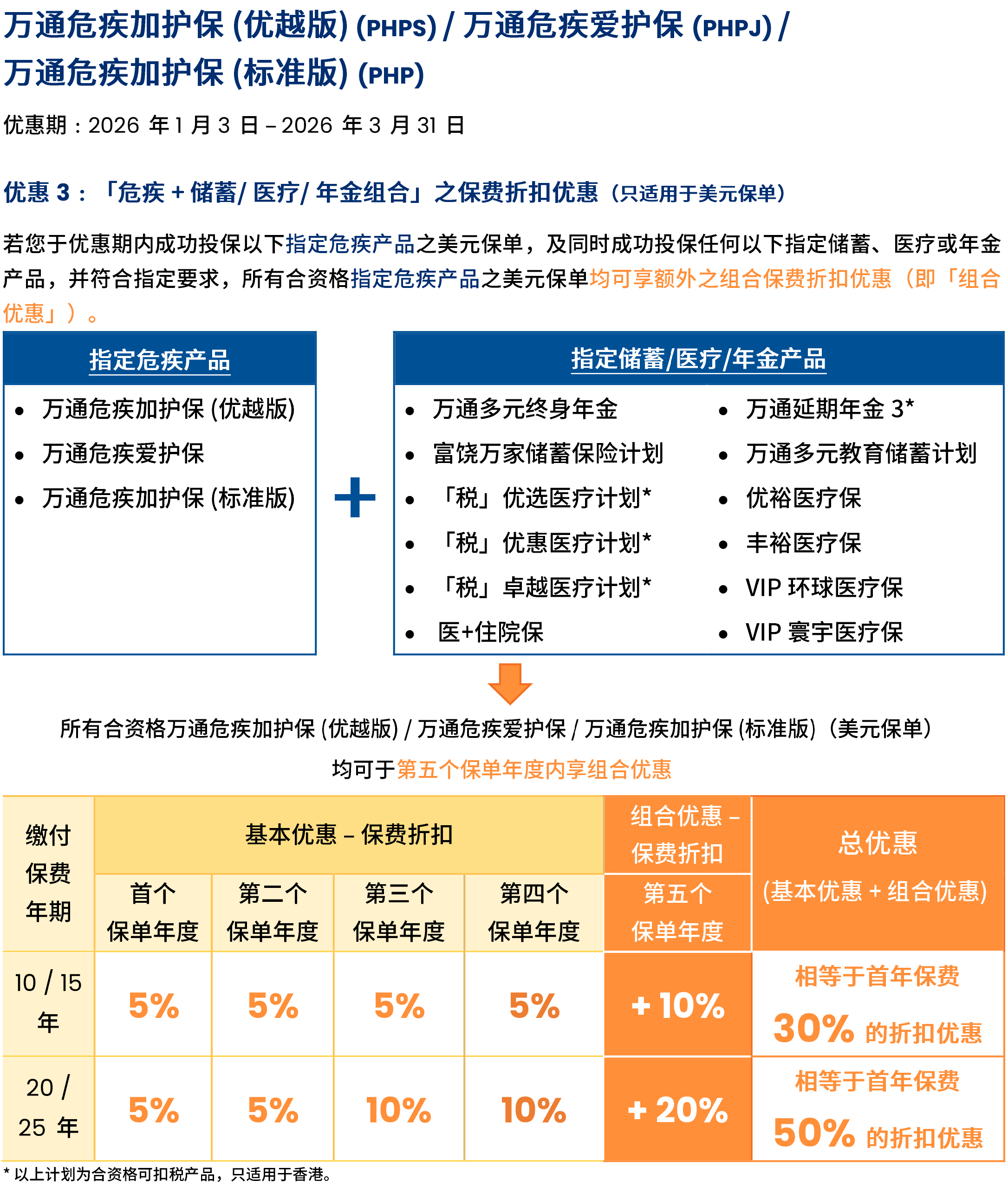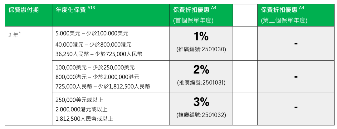 2026年1月5日至2026年3月31日优惠:同一投保人于推广期内申请以下指定计划连同指定缴费期的合资格产品,可在现行优惠基础上,第二个保单年度额外享更高达15%/8%保费折扣优惠