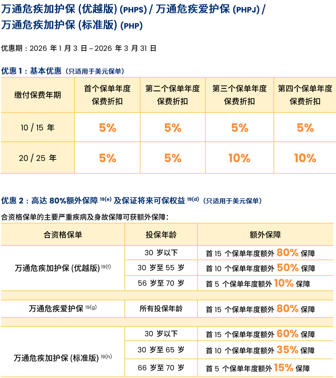 2026年1月3日-2026年3月31日(2026年6月30日或之前成功批核)折扣优惠:长达4年保费折扣,保费折扣合计高达30%!首15年额外保障高达80%!危疾+储蓄组合优惠高达50%!