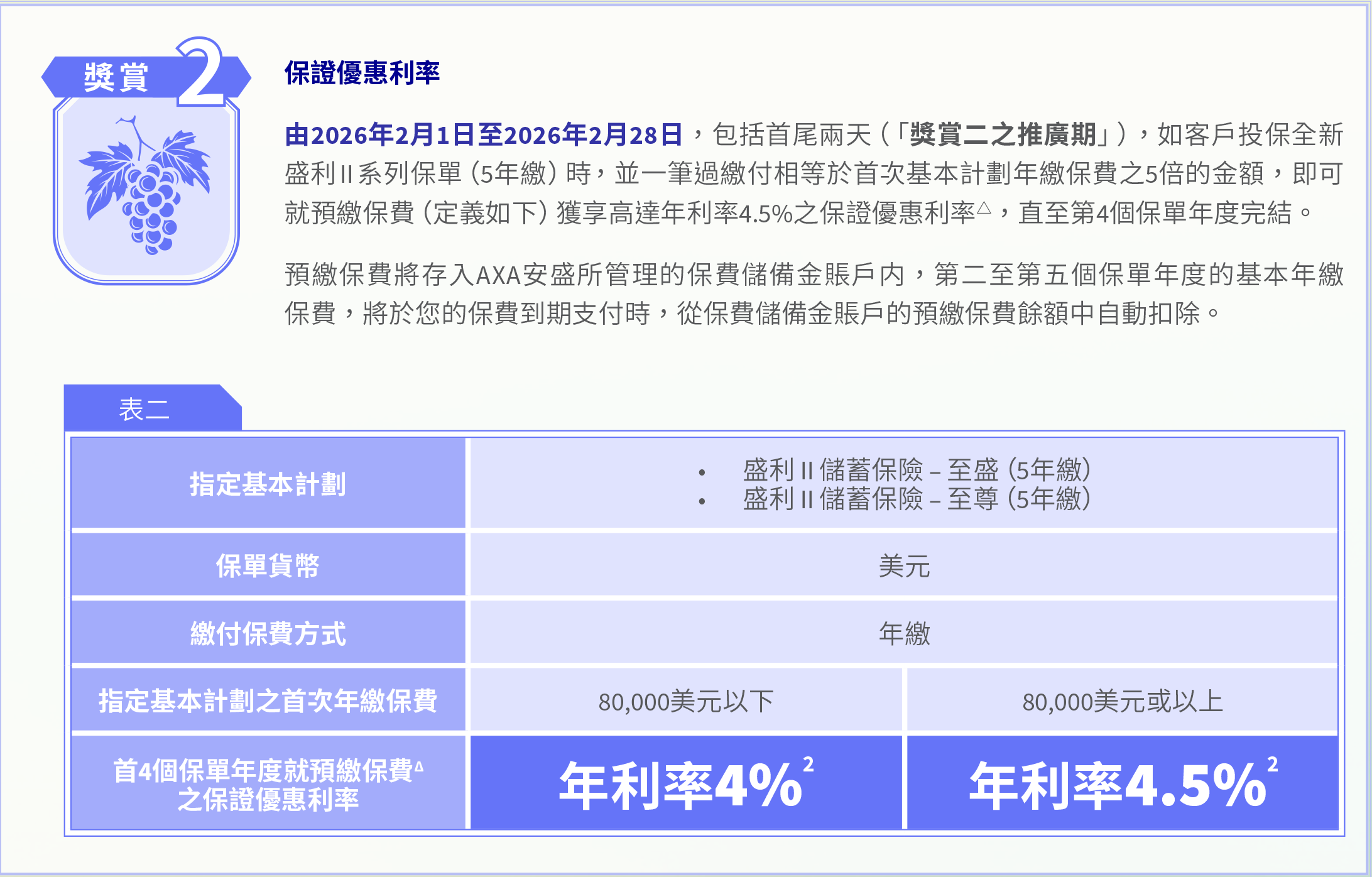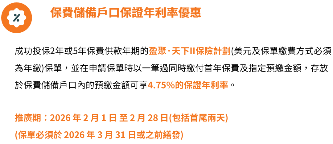 2、储蓄险「盈聚天下」2026年2月1日至2月28日(须于2026年3月31日或之前缮发)预缴优惠:成功投保2年/3年/5年缴保单,享高达4.75%保证利率