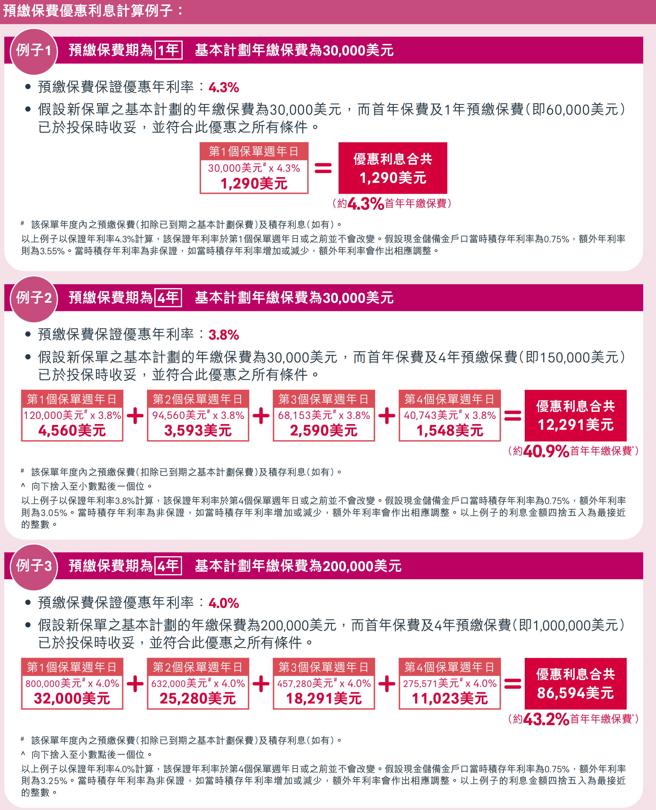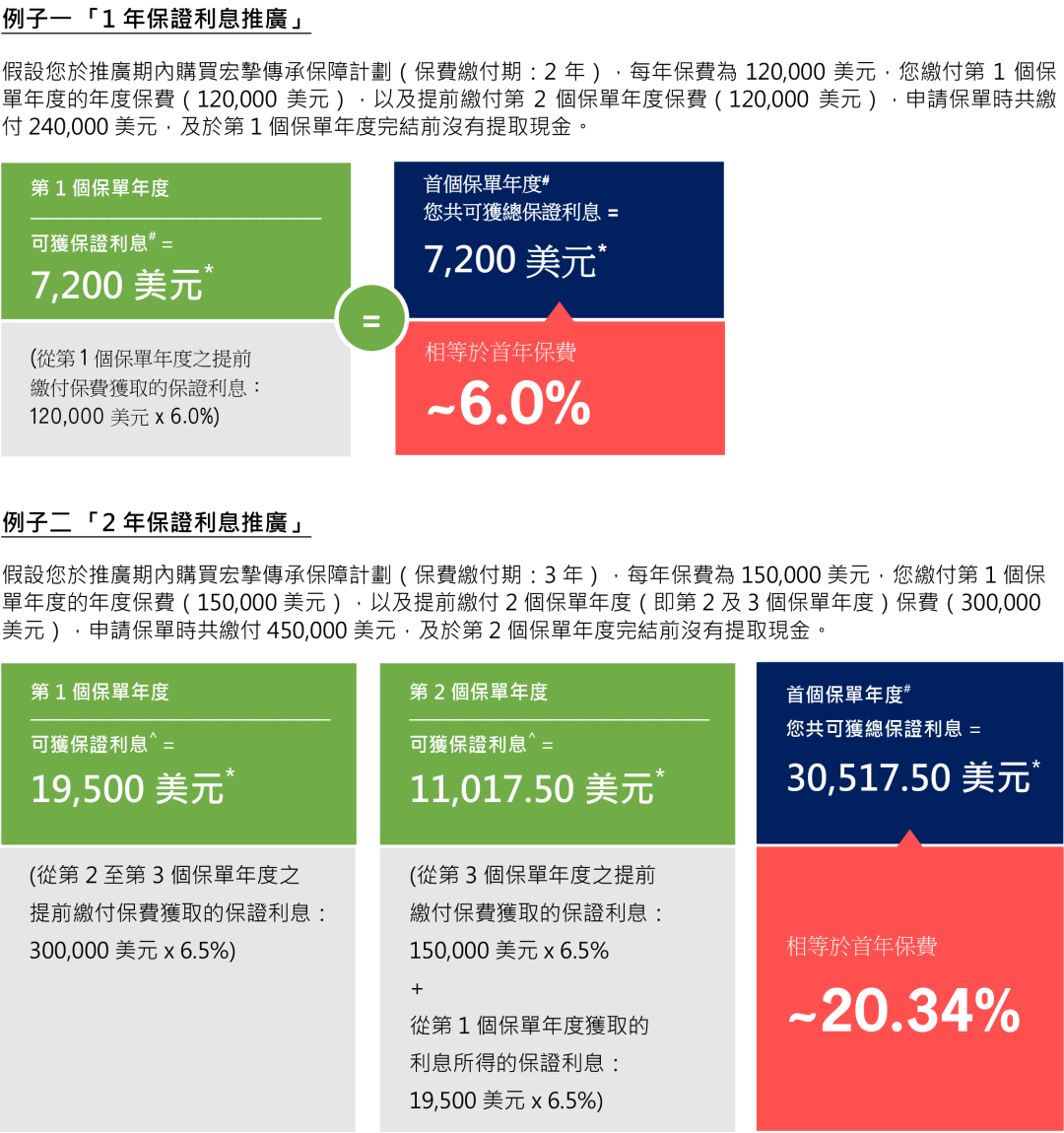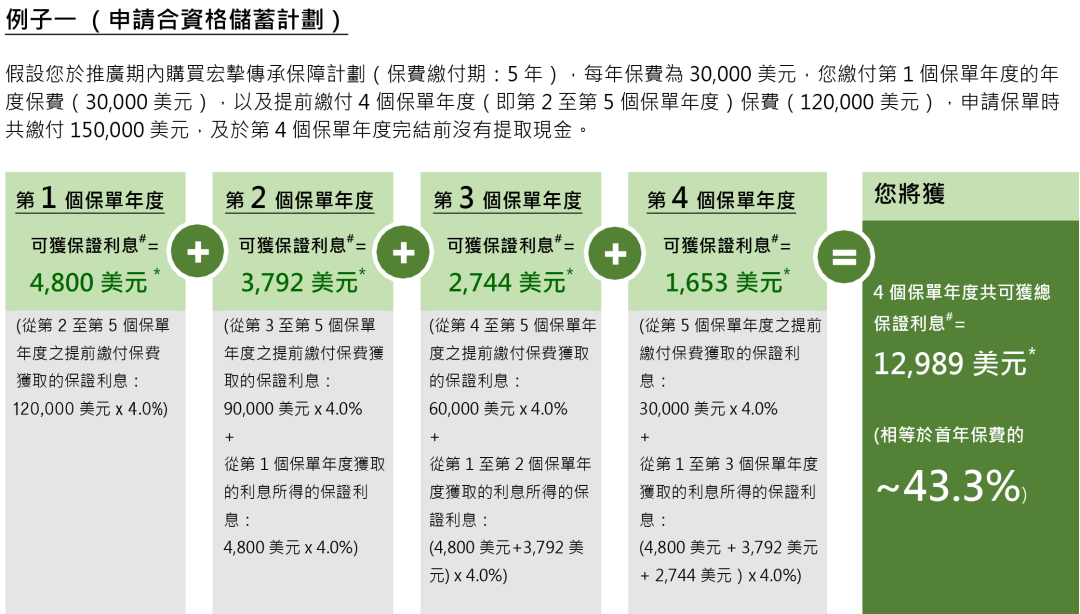 若年度化保费≥8万美元,则预缴第2-5年保费均享受4.5%利息;如果同时投保危疾/人寿等,额外享0.5%预缴利息也就是5.3%,相当于首年保费的55.2%,将于第4个保单周年日后的8周内存入。
