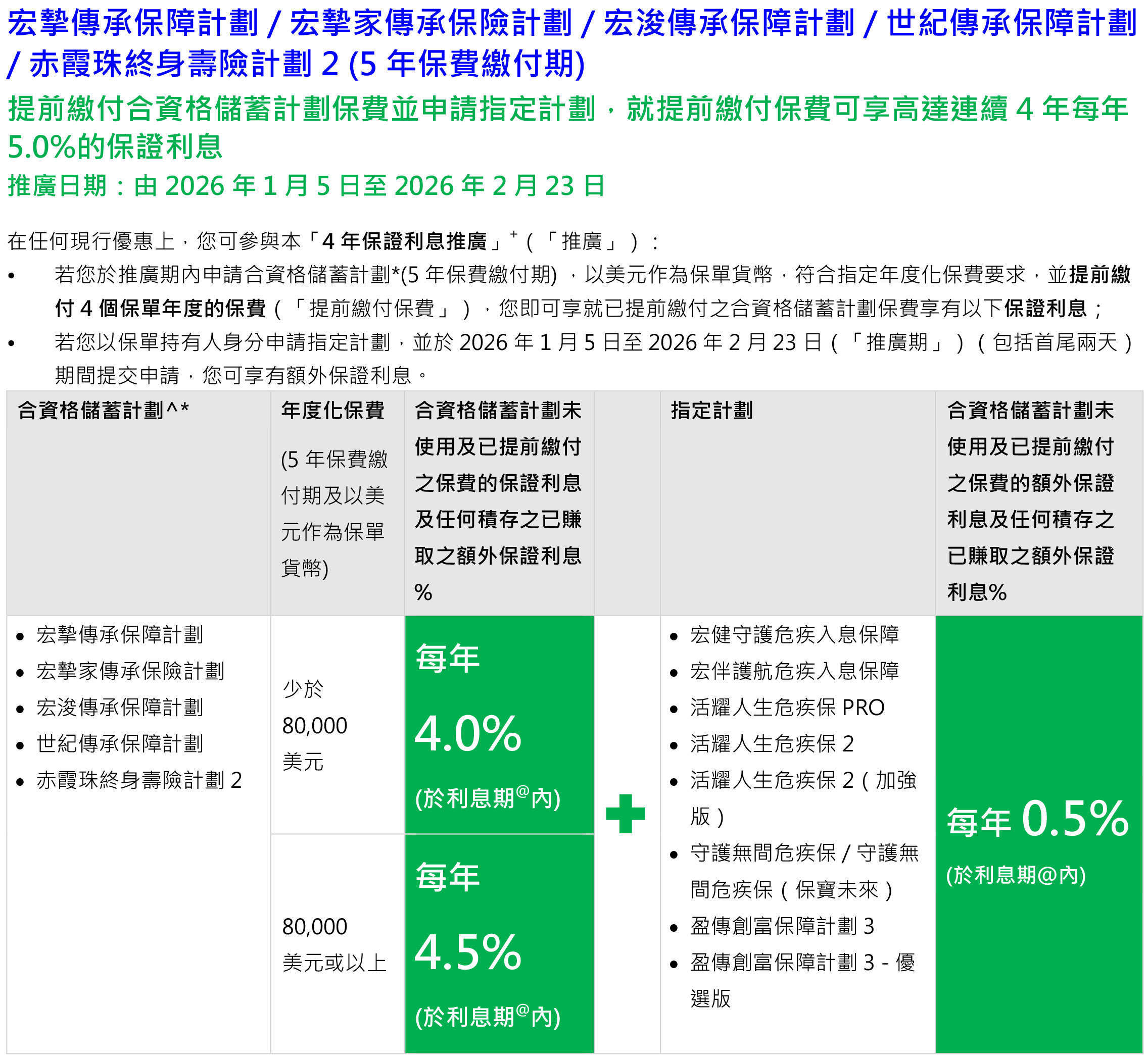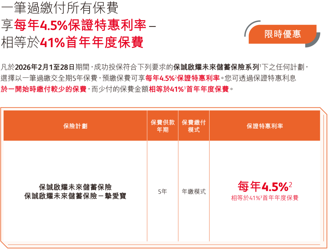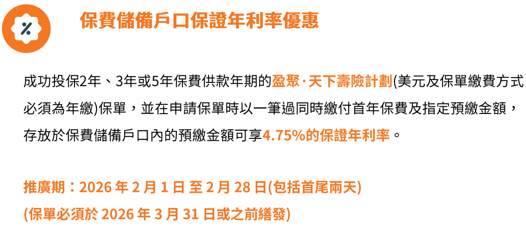 2026年2月1日至2月28日(须于2026年3月31日或之前缮发)预缴优惠:成功投保2年/5年缴保单,享高达4.75%保证利率