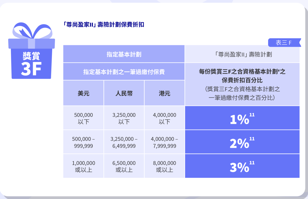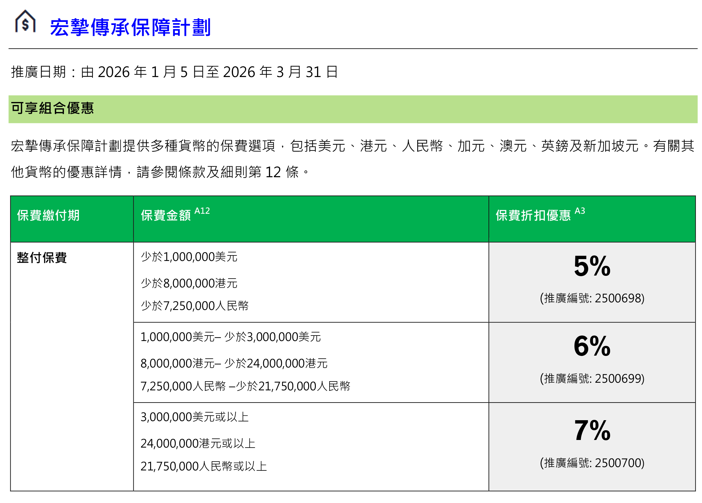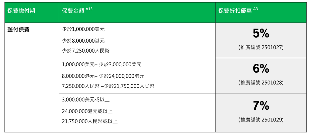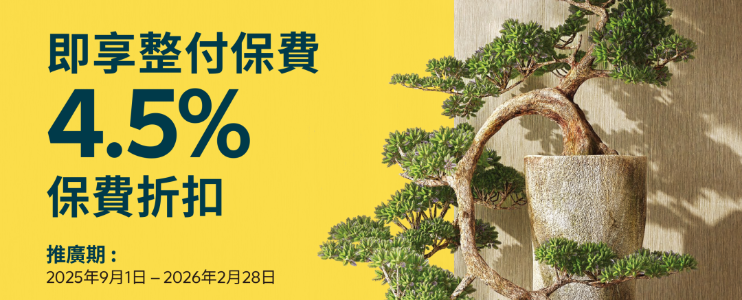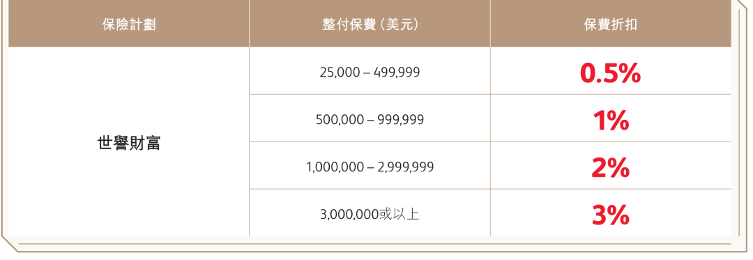 2026年1月1日至3月31日(须于2026年5月31日或之前缮发保单)折扣优惠:一笔过缴付保费,享高达3%保费折扣!