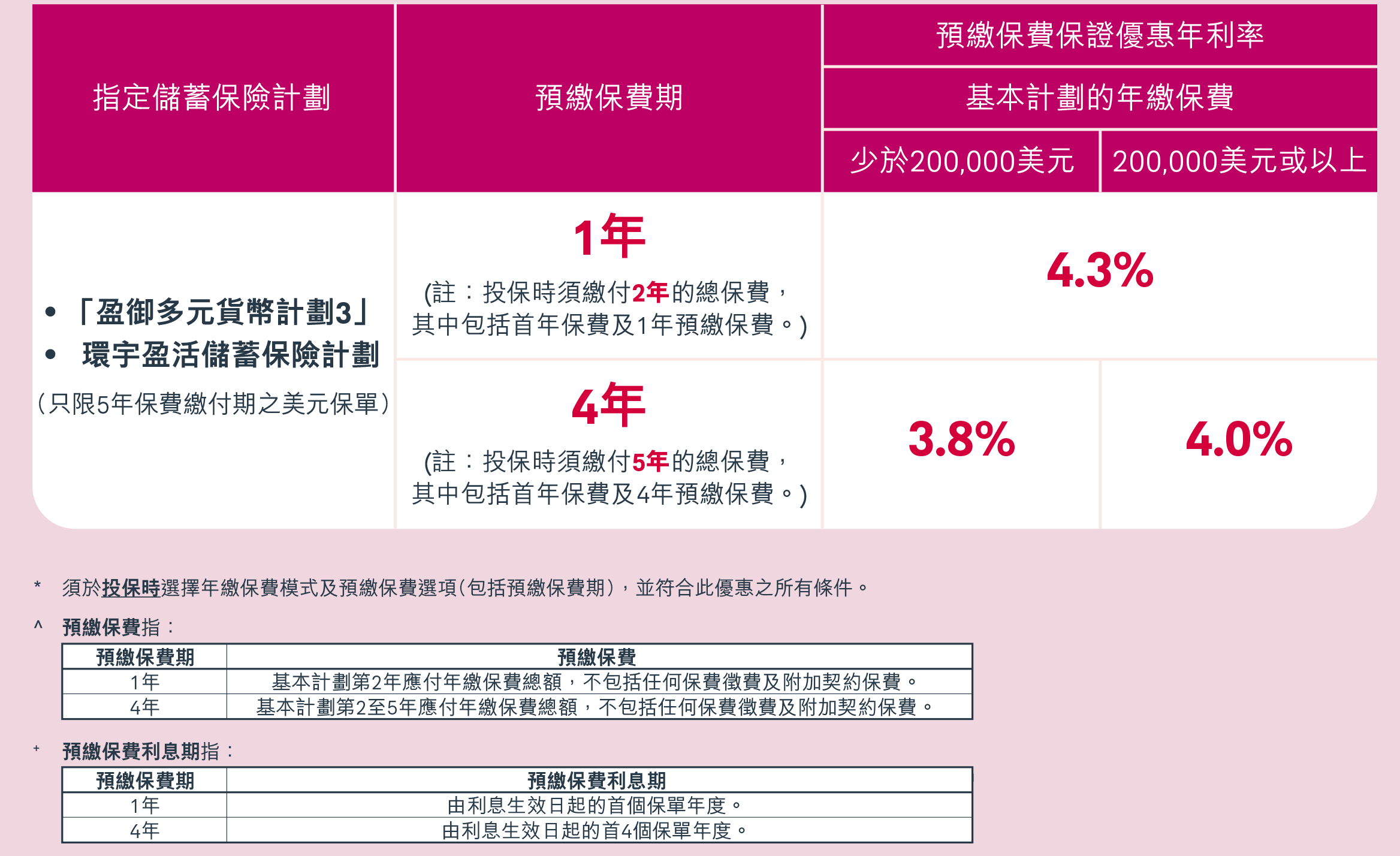 预缴优惠2026年2月1日-28日(须于2026年4月30日或之前缮发)5年缴保单,预缴1年保费,享4.3%保证利率;预缴4年保费,每年享高达4.0%保证利率