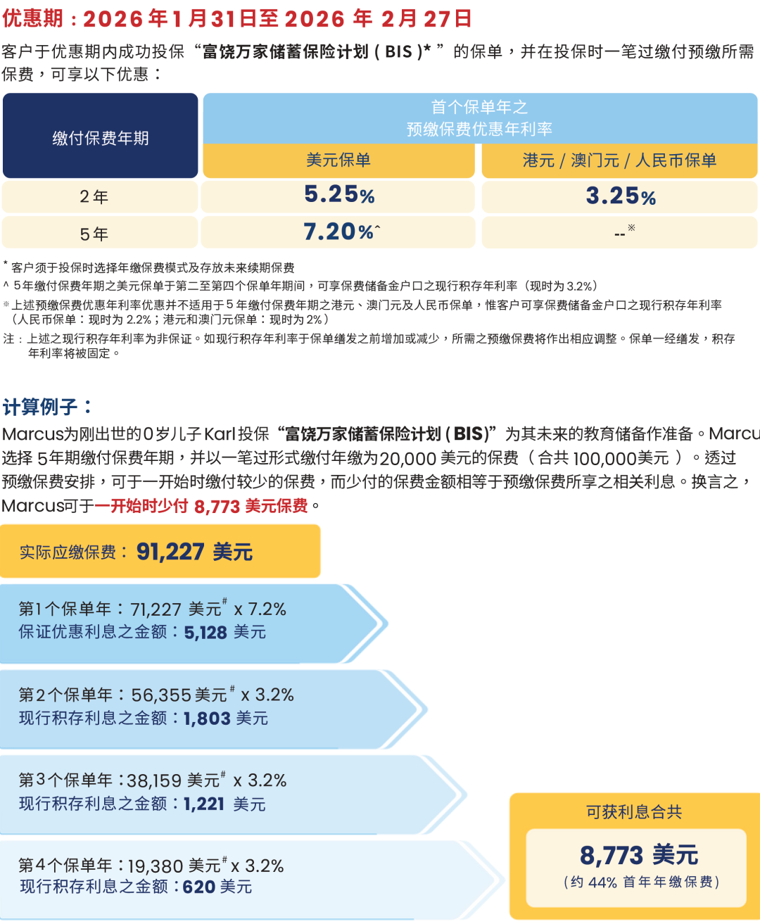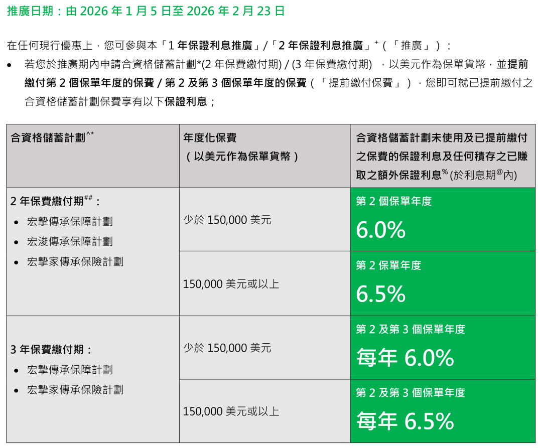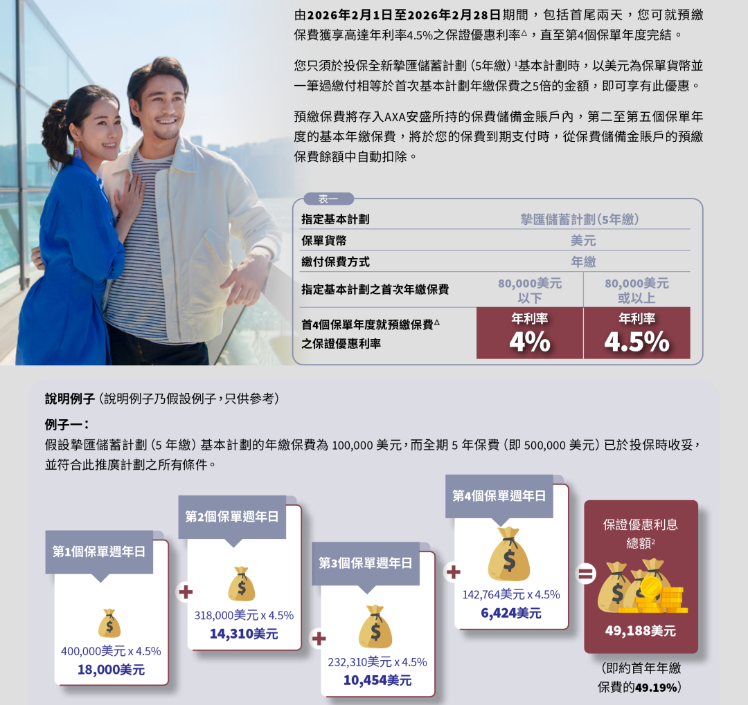 2026年1月31日至2026年2月27日预缴优惠:预缴5年美元保单保费,保证利率高达7.2%(仅一年,其他年份提供非保证3.2%利率),相当于44%首年保费,2026年2月27日截止。
