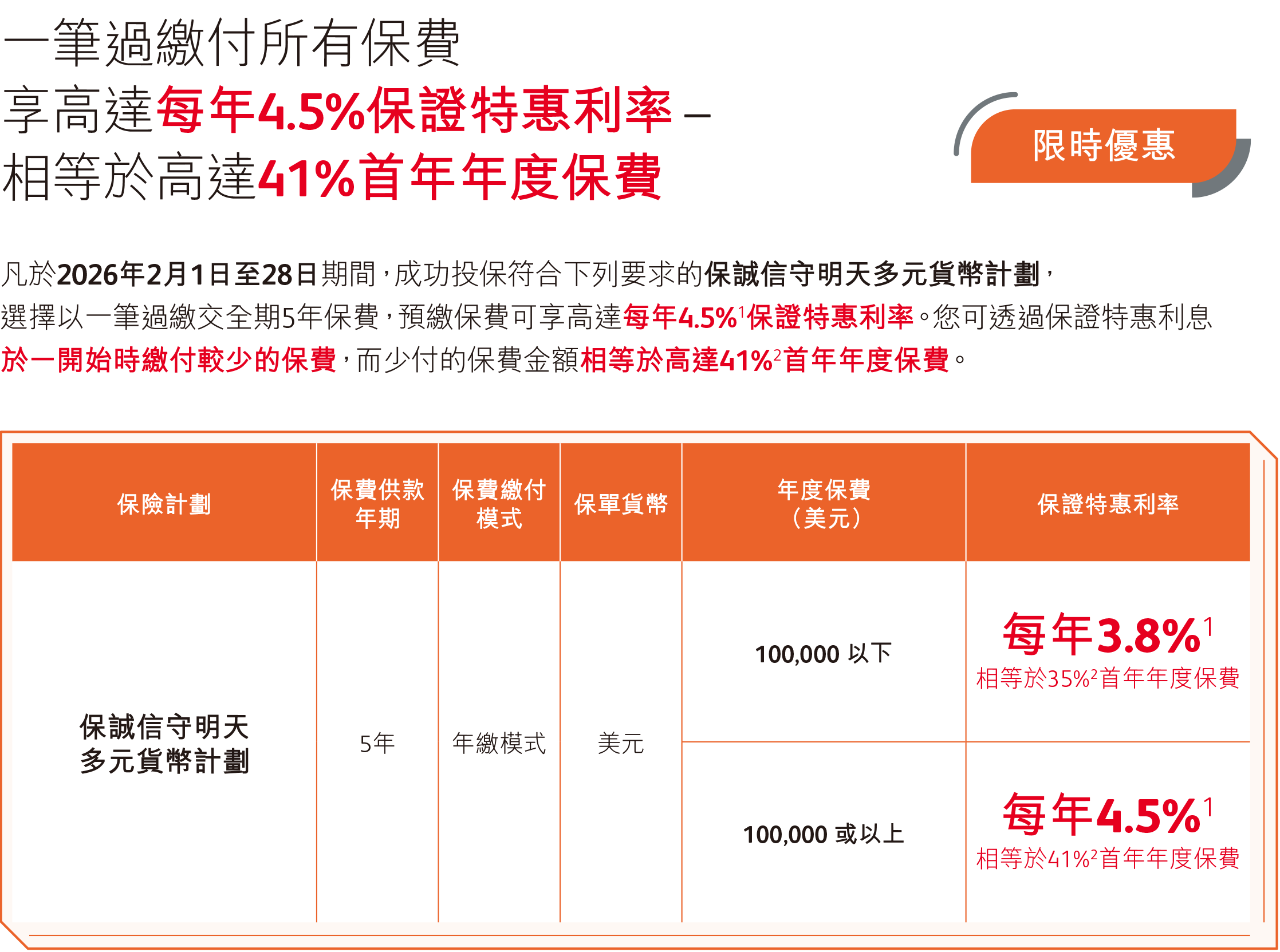 预缴优惠2026年2月1日-28日(须于2026年3月31日或之前缮发保单)预缴优惠:5年缴「保诚信守明天多元货币储蓄计划」,年度保费<10万美元,每年享3.8%保证利率;年度保费≥10万美元,每年享4.5%保证利率,最高可省41%首年保费!