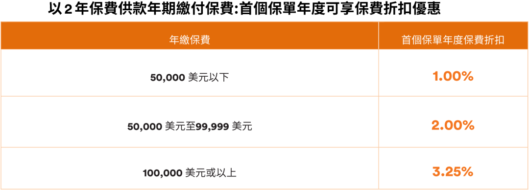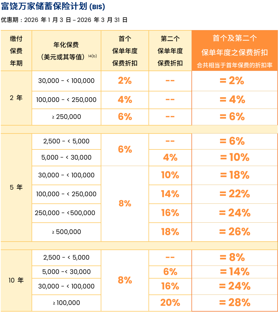 2026年1月3日至2026年3月31日(2026年4月30日或之前批核)折扣优惠:2年缴,首年保费折扣高达6%;5年缴,首年+次年保费折扣合计高达26%;10年缴,首年+次年保费折扣合计高达28%!