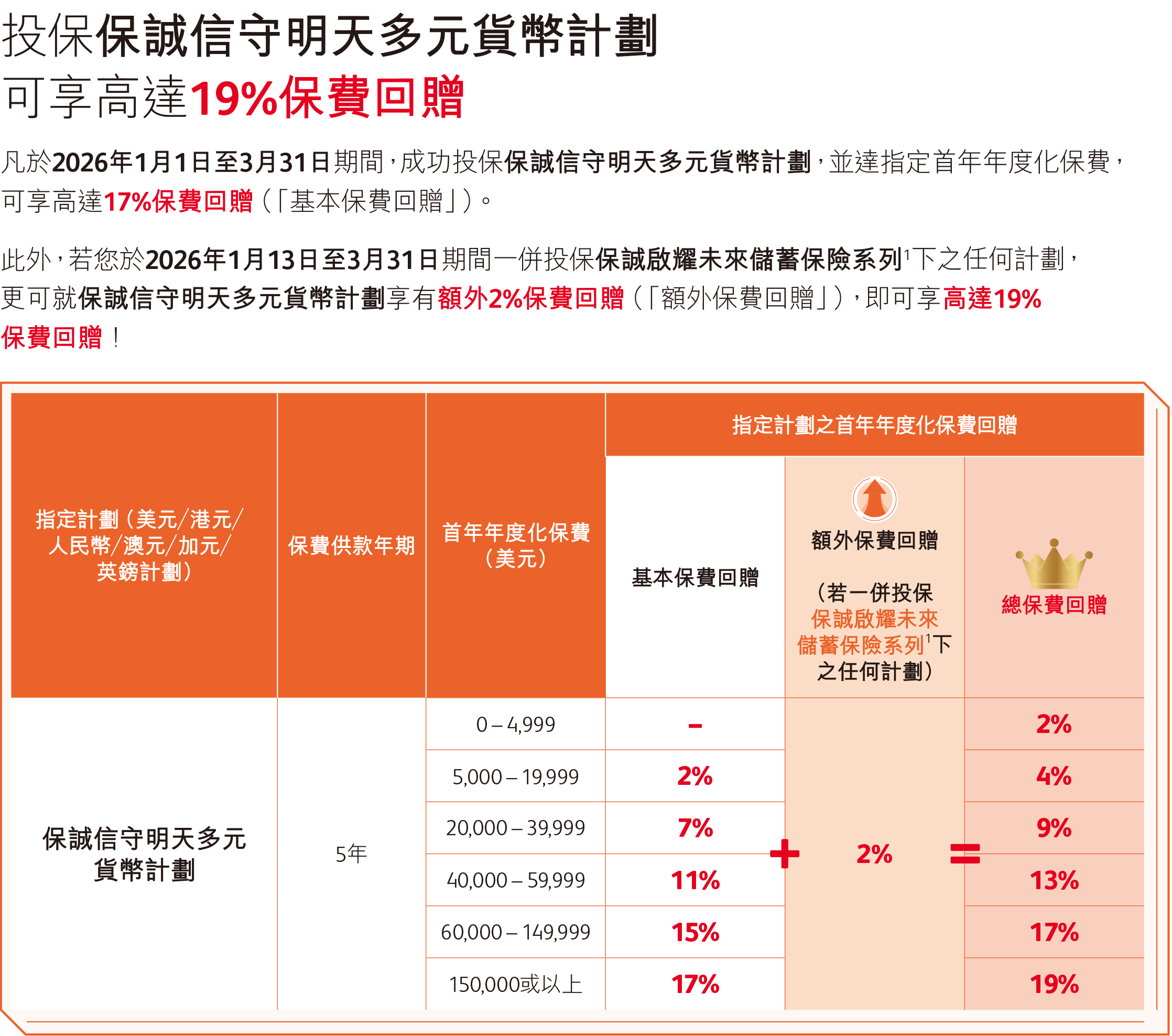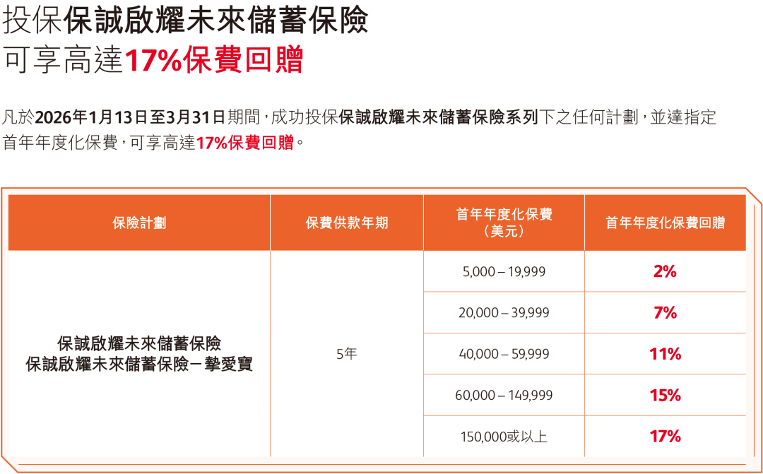 2026年1月1日至3月31日(须于2026年4月30日或之前缮发保单)回赠优惠:5年缴保单,享高达17%保费回赠。同时投保「启耀未来」额外2%保费回赠,即可享高达19%保费回赠。