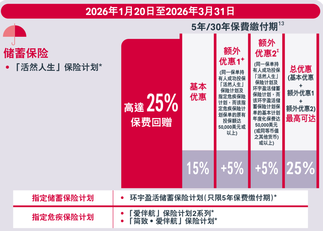 2026年1月1日至3月31日(须于2026年5月31日或之前缮发保单)回赠优惠:5年缴保单,享高达26%基本保费回赠+额外3%保费回赠10年缴保单,享高达28%基本保费回赠+额外3%保费回赠
