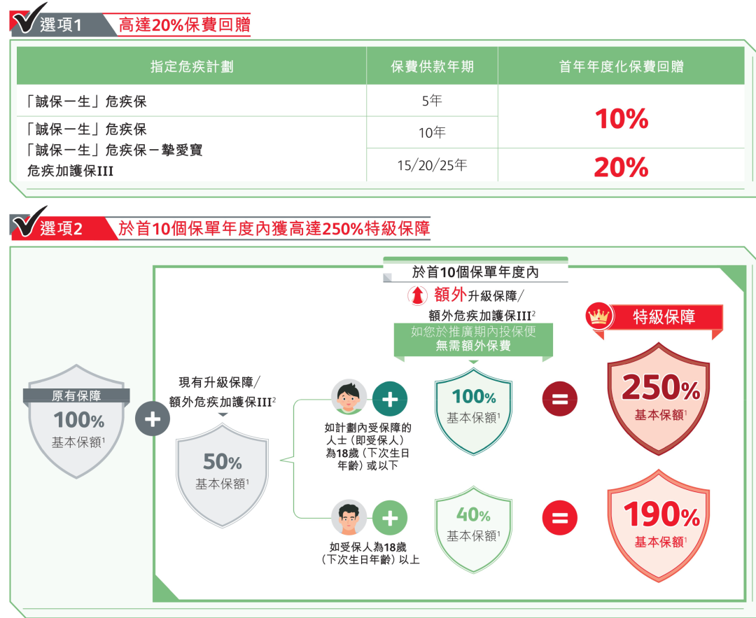 2026年1月1日-3月31日(须于2026年5月31日或之前缮发)优惠:享高达20%保费回赠或首十个保单年度内享高达250%保额保障!