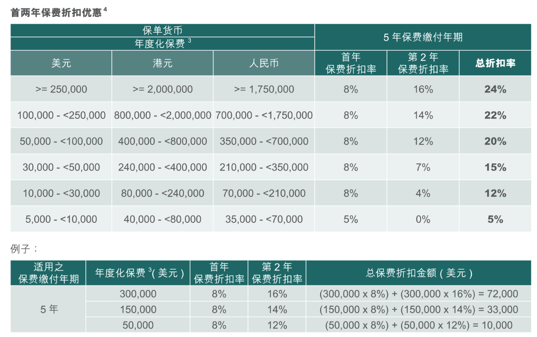若年度化保费<8万美元,则预缴第2-5年保费均享4%利息,相当于首年保费的43.3%;