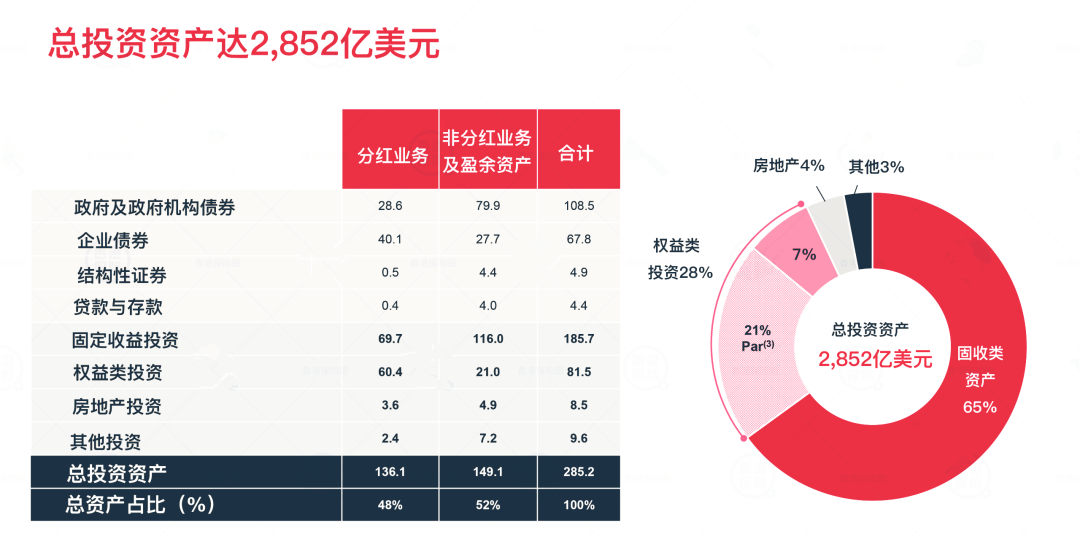 友邦能实现稳定收益,离不开稳健的全球投资布局,2852 亿美元总投资资产中,65% 配置于固定收益类资产,为分红产品储备充足长期动力: