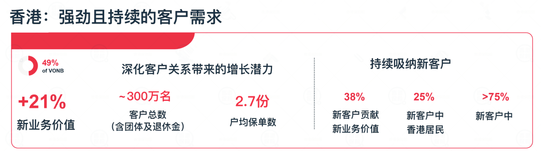 作为友邦的核心市场,香港 2025 年业绩表现堪称 “教科书级”:新业务价值同比提升 28% 至 22.56 亿美元,客户总数突破 300 万名,新客户贡献 38% 的新业务价值,户均保单数达 2.7 份,客户粘性持续深化。