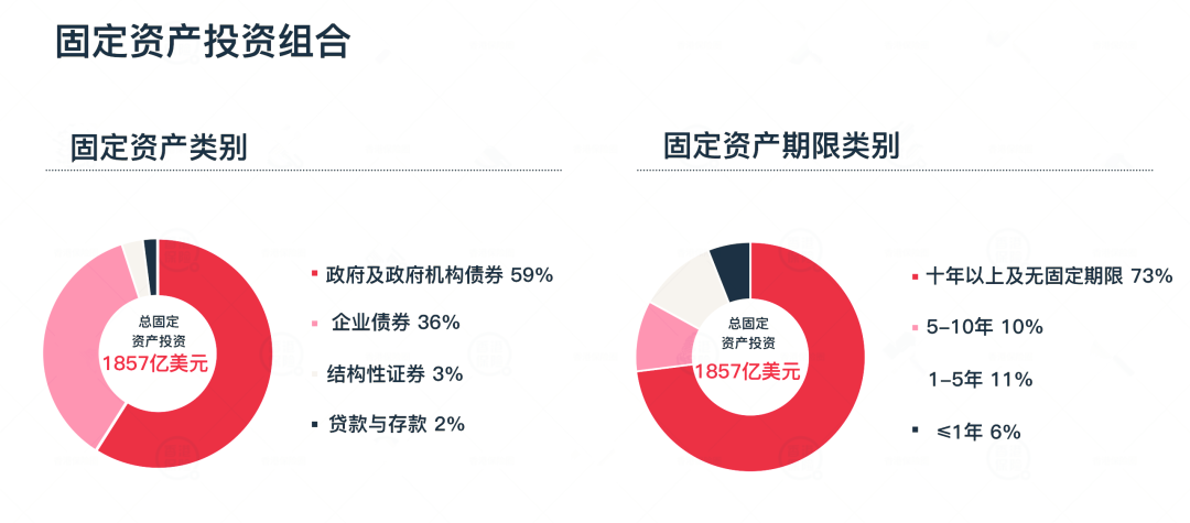 固收类资产 1857 亿美元,占比 65%,其中政府及机构债券占 59%,企业债券占 36%,合计占固收资产 95%,安全性拉满;