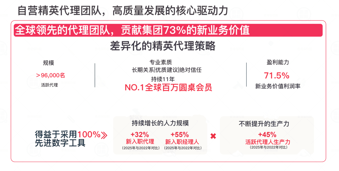 规模与素质双升:全球代理团队超 9.6 万名,2025 年新入职代理较 2022 年增长 55%,新入职经理人增长 32%;